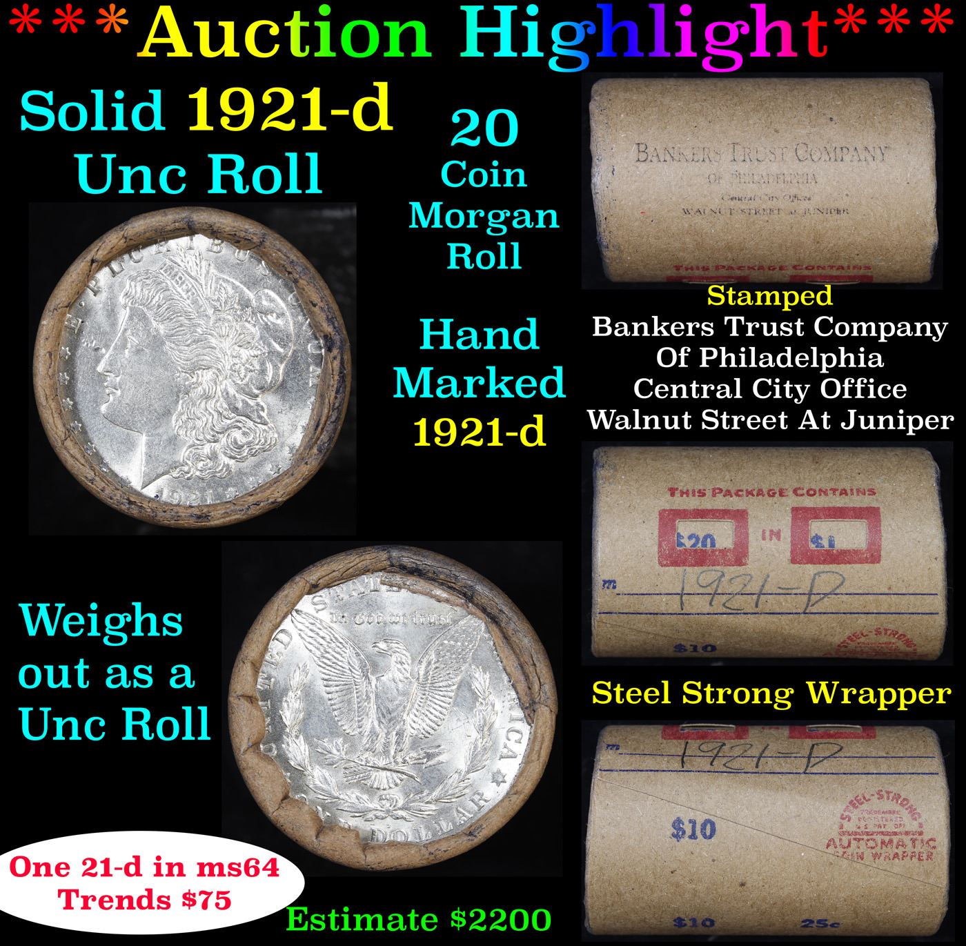Full solid date Uncirculated 1921-p Morgan silver dollar roll, 20 coins. Uncirculated Morgan Dollar Roll, Superb Ends. This roll is held in an old Steel strong wrapper, patented 1921, stamped "Bankers Trust Company of Philadelphia, Walnut Street at Juniper. Weighs Perfectly as a Uncirculated Roll.