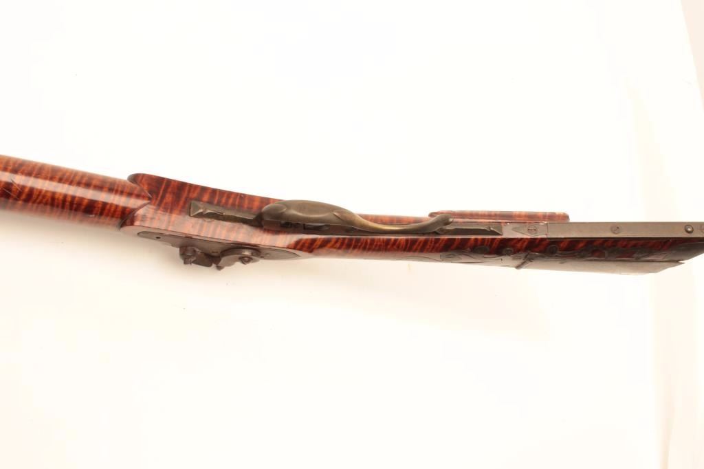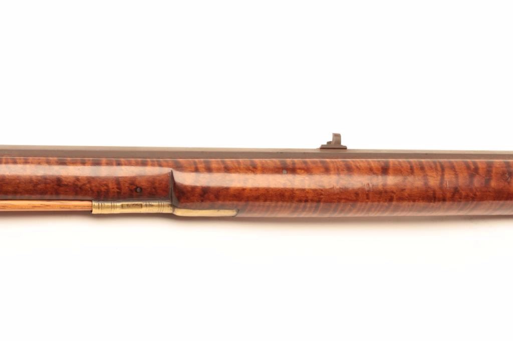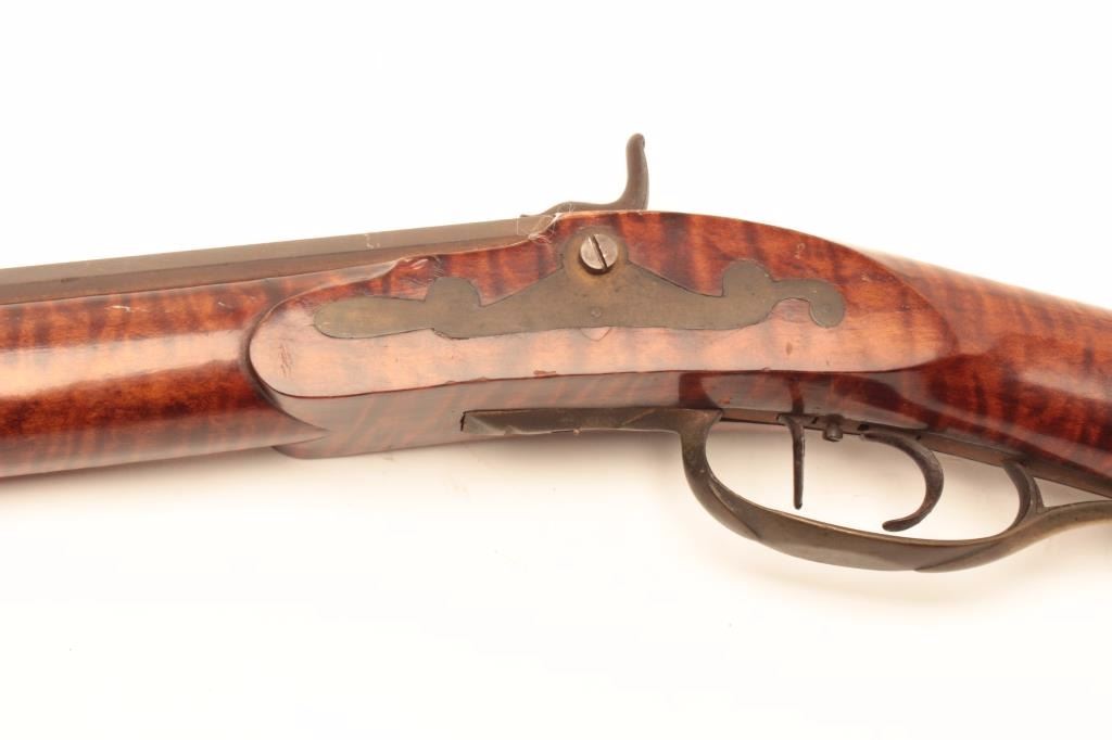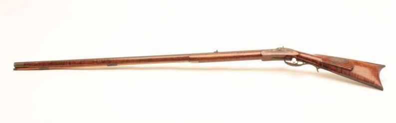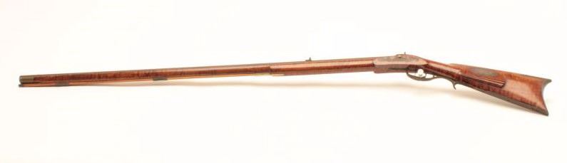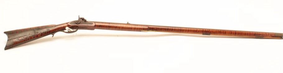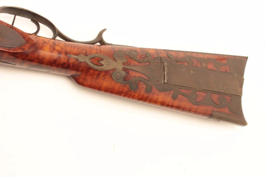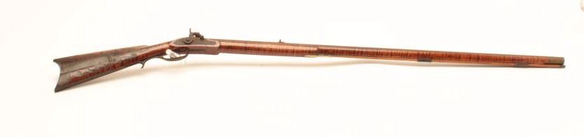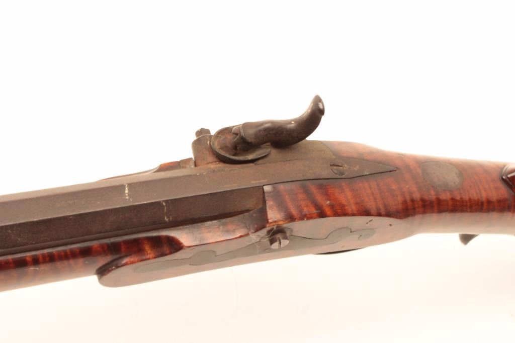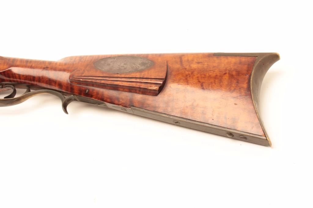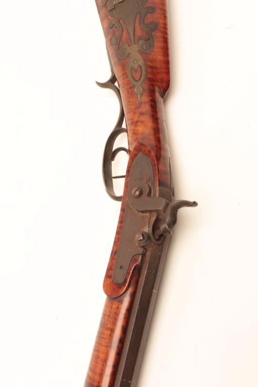Full stock Kentucky percussion rifle, .38 caliber, 42” octagon barrel marked “J. TEAFF”, tiger stripe wood stock, brass mounts including patchbox, double set triggers (working at time of description); piercedplaque on left side of butt stock with American eagle, in overall very good condition showing a heavy dark un-cleaned patina to metal and pleasing patina to wood stock. This is the way collectors like tofind examples of Kentucky rifles. (Antique). Est.: $1,500-$3,000.