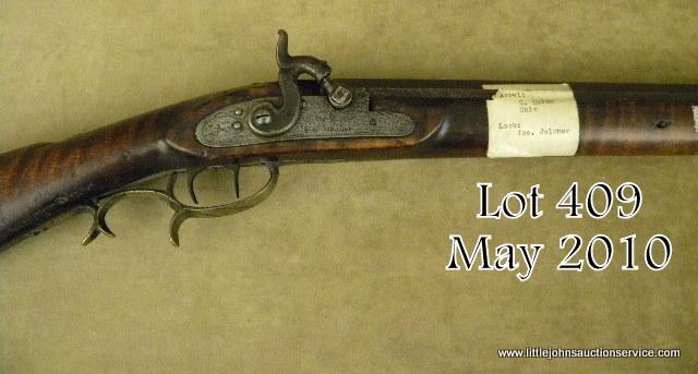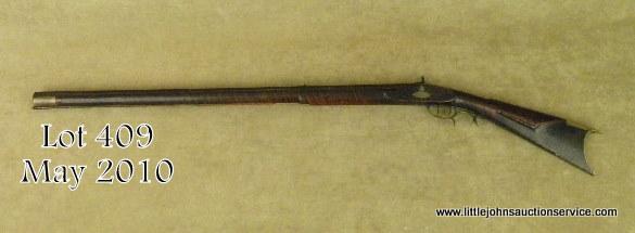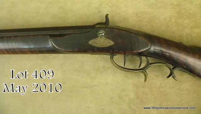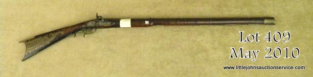Full stock Kentucky style percussion short rifle, .36 cal., 33-1/2” octagon barrel marked “C. Coton, No. 5”, Golcher-marked lock, double set triggers, tiger striped wood stock, fancy patchbox, brass trigger guard, butt plate, ramrod ferrules andfore stock tip. This gun is in overall good condition showing a great dark patina to the barrel and lock plate with some moderate old pitting around the firing area, set triggers working at time of description; good action, darkbore, dark patina on brass furniture including the classic three-part patchbox with stylized engraving; the wood shows a deep patina from age with some scattered nicks, mars and scratches from years of carry and storage and on old loss at the right side of the stock just behind the brass end cap. A really nice untouched classic full stock with wood ramrod retained. Est.: $350-$700.