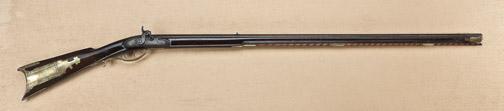 Full stock percussion Kentucky style rifle, unmarked, approx .40 caliber, with 40-1/2” medium octagon weight barrel, 56-1/8” overall. Stock shows natural striping and plain patchbox with daisy type finial. The cheekpiece area shows a finely engraved silver eagle holding arrows with shield on chest. The stock shows an old break just behind the wrist and a heavy coating of old violin type revarnish which is very thick and the type used in the 19th century. The metal surfaces show a heavy patina with some pitting around the lock area. The front 8” of the rifle show some new rust that will clean. From the Bernard Braverman collection. Est: $800 - $1,600