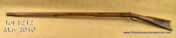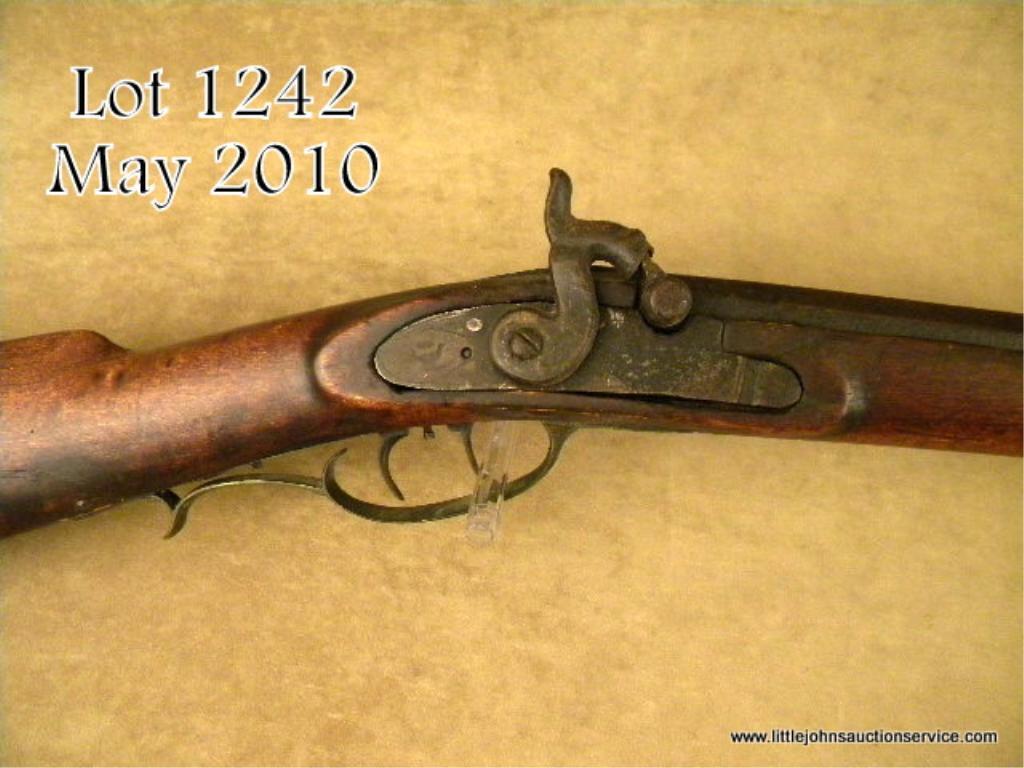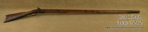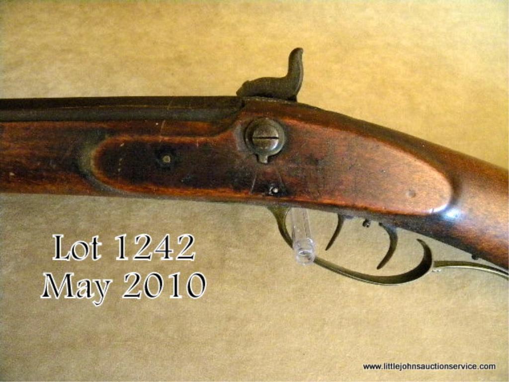 Full stock percussion plains rifle, approx. .40 caliber rifled, 46" barrel, 61-1/2" overall, medium weight. Good condition showing heavy brown patina, out of the attic condition, lock working, stock good, period ramrod retained. Has aTennessee look, circa approx. 1840's to 50's. Just the type rifle carried West by the fur trappers and pioneers before the Civil War. Est: $500 - $1,000