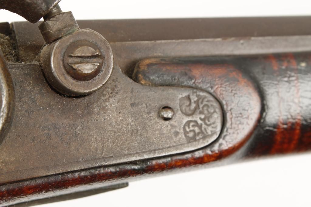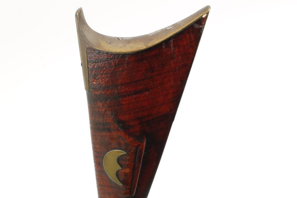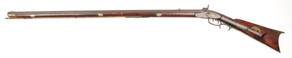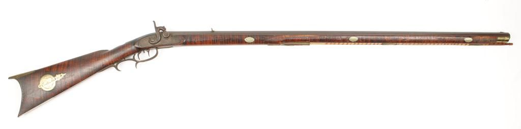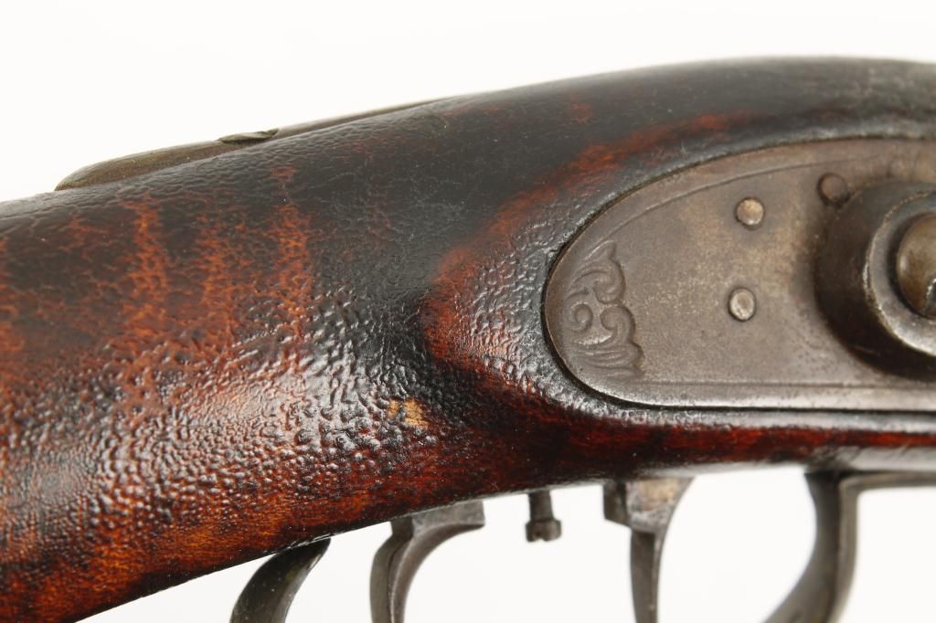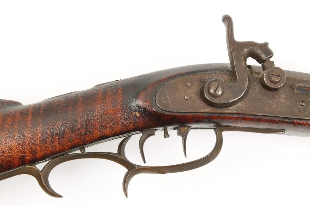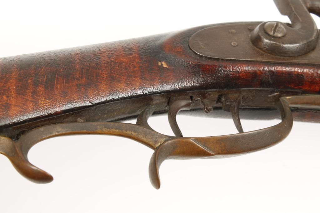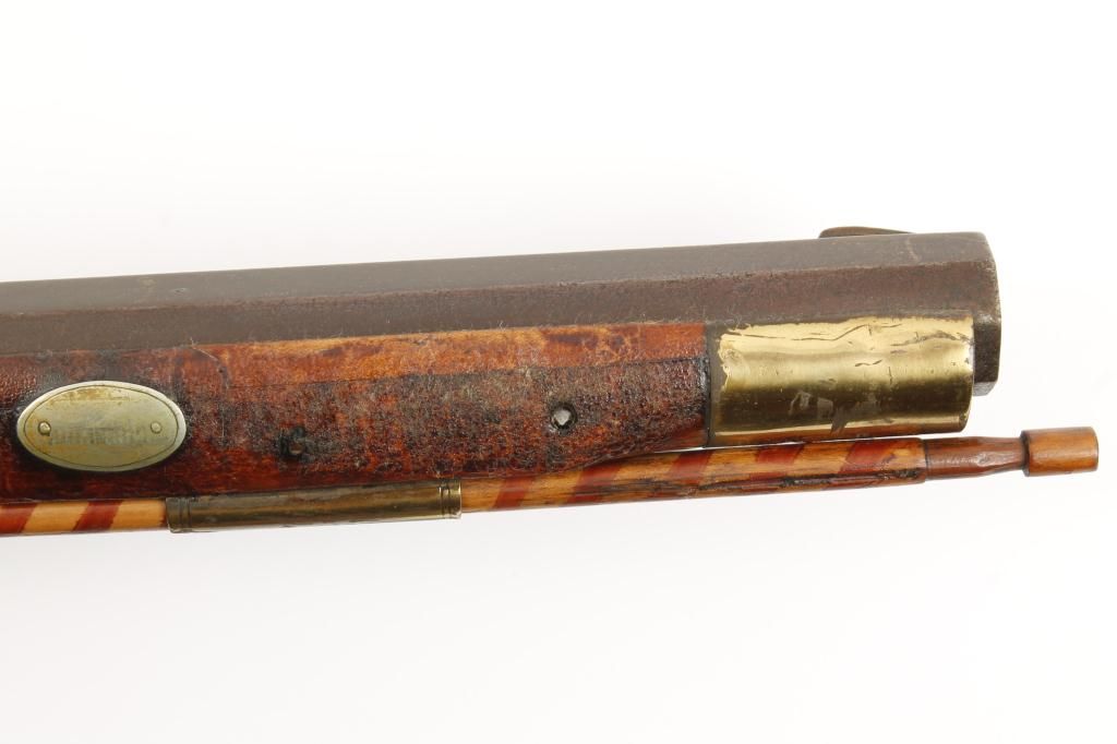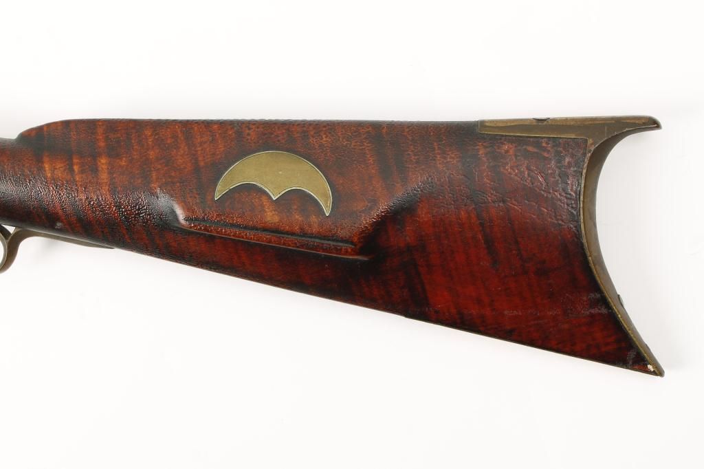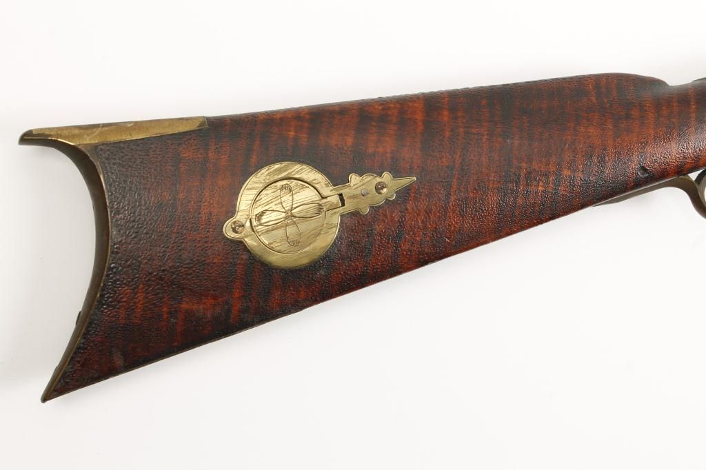 Full stock percussion trade style plains rifle with no visible markings on lock or barrel and simply brass mounted in .36 caliber percussion. The rifle measures 53” overall with a 37 ½” medium weight octagonbarrel. There are odd scrolls on the back and front portion of the lock that may be identifiable. The disc patch box is slightly engraved and there are small typical American style inlays in the stock. The metal shows a dark brown patina with light pitting and is good. The forend shows replacement of wood and about half way down. The stock has had the finish crazed and melted. There is a plaque inlaid into the wrist with engraved“O”. The lock works well. Est.: $500-$1,000.