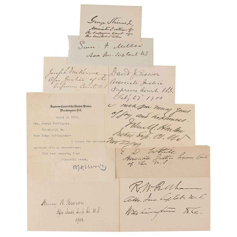Group of nine items signed by associate justices of the Fuller Court, primarily including signatures on individual slips and cards. Includes: John Marshall Harlan, George Shiras, Samuel F. Miller, David J. Brewer, Henry B. Brown, Joseph McKenna, Rufus W. Peckham, Edward Douglass White, and William Henry Moody (TLS). In overall fine condition.