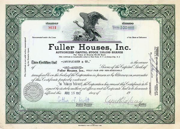 1947, Delaware. Stock certifcate for 100 shares. Green/White. Vignette of a spread eagle perched on a cliff. Uncancelled and very fine.