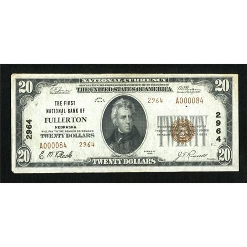 <B>Fullerton, NE</B></I> - $20 1929 Ty. 2 <B>The First NB</B></I> Ch. # 2964<BR> This note is listed in the census as <B>Crisp Uncirculated. </B></I>It does not have any folds, yet it does have several pinholes with some being enlarged. The top and bottom edges also show minor wallet crimping.<BR><BR><b>Shipping:</b> Coins & Currency (<a target="_blank" href="http://www.heritageauctions.com/common/shipping.php">view shipping information</a>)