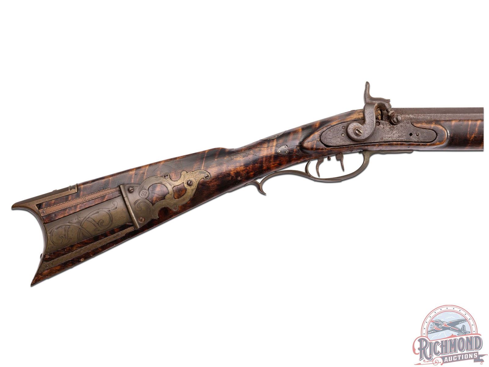 Unusual percussion Kentucky rifle attributed to Nicholas Shennefelt of Huntingdon County, PA. and later of Clarion County, PA., circa 1840. This rifle measures 56" overall with a 40" octagon rifled barrel in 44 caliber with no markings. This rifle has some parts which appear to be recycled from an earlier rifle of higher quality. The silver heart wrist inlays, the Hunter's Star barrel escutcheons, silver thumbpiece, brass football sideplate and double shield patchbox with Ram's Horn engraved lid resemble parts from a John Armstrong rifle. The lid of the patchbox shows evidence of fitting with engraving being cut off as does the sideplate. Although both makers used this style patchbox, architecture resembles more what Shennefelt did and is comparable to other rifles. Rifle has a "Josh Golcher" percussion lock with double set trigger control. Full curly maple stock with profile similar to Shennefelts with ten coin silver inlays, including an eagle similar to Shennefelt. CALIBER: 44. FFL STATUS: Antique.