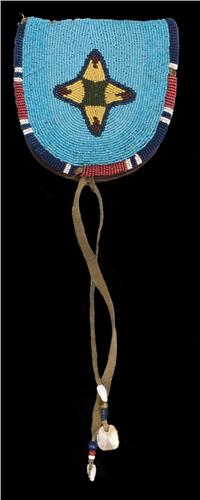 Fully Beaded Dispatch Case. 4 ½” x 4 ½”. Front flap beaded on harness leather. Contains an old map. Fine condition. (est $750-1,000)