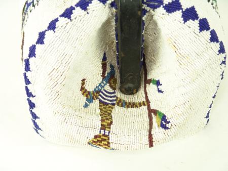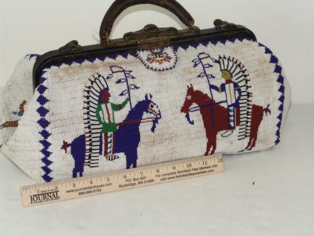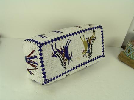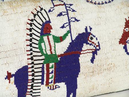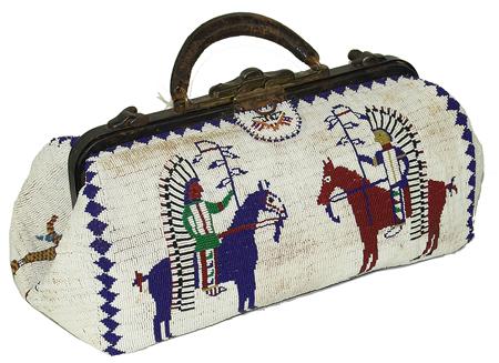Circa Late 1900s, Beautiful and elaborate Sioux style hard leather bag with human figures, horses, and other traditional symbols on a white ground. Very good condition. 8" x 16" x 8"