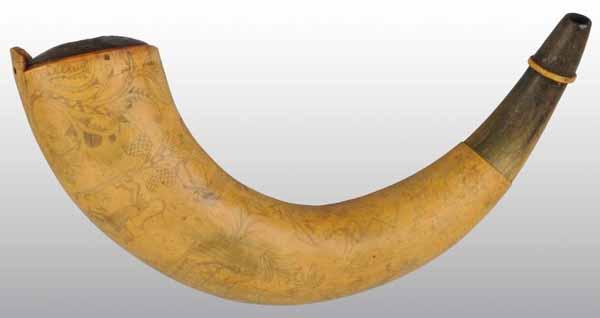 Description 13 - 1/2” L. Original surface with deep curved body engraved with three masted gun ships, two masted ships, floral designs, and animals consisting of deer, dogs, and birds. Condition (Very Good).