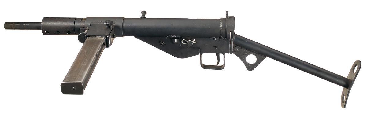 Remanufactured from WWII British STEN MKII parts in the 1980s, with the front sight removed, peep rear sight, makers marks on top of the receiver tube, 2 position selector switch, safety catch, and tube stock with a pistol grip section and a flat buttplate. With four magazines. NOTE: This is a fully transferable NFA Class III Firearm currently on a Form 4. You are required to check your state and/or local laws as to whether or not you may own this. This weapon can be transferred to a Class III dealer at no charge. Buyer pays all other transfer fees and stamps.