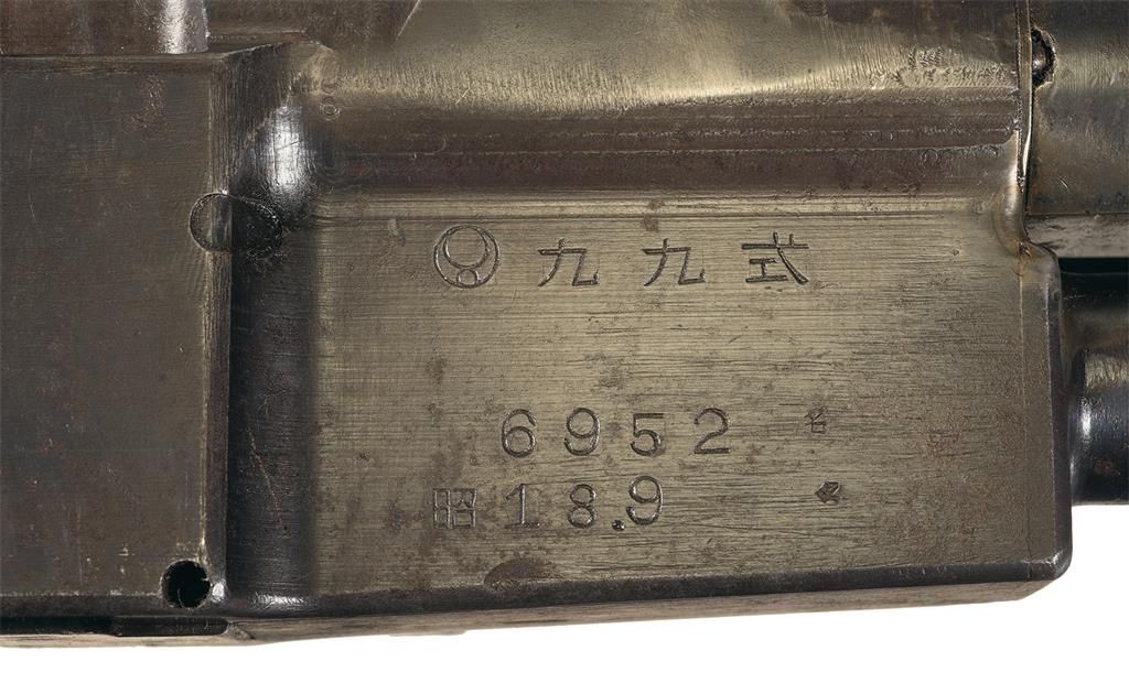 Manufactured by the Nagoya Arsenal and bearing the Showa date of 18.9 (September 1943), this is a fine example of the Japanese Type 99 Machine Gun. Introduced as the Imperial Japanese Army was transitioning to the 7.7mm Arisaka as their chief infantry cartridge, the 99 was introduced to replace the 6.5mm Type 96, with a few additional alterations made to improve reliability. Fitted with a fluted barrel with on-board carry handle, hand-adjustable gas tube with bipod and bayonet lug, and left-offset sights with a windage and elevation adjustable rear peep. The magazine is top-loading, with a spring loaded ejection port cover, non-reciprocating bolt handle, and 2-position safety. Fitted with a ribbed pistol grip and a smooth hardwood buttstock with a steel buttplate and folding monopod. This weapon is registered with the BATFE as a NFA/Class III weapon.
