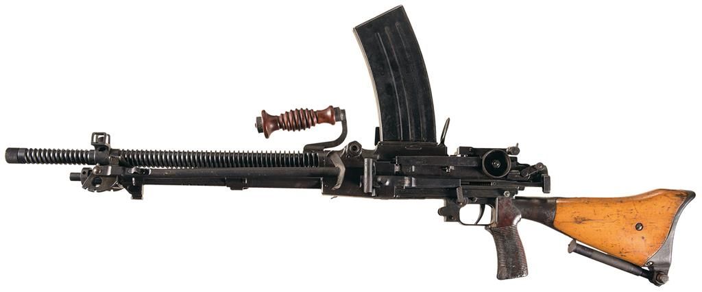 Very fine, with 70% of the arsenal blue finish, showing areas of brown patina, mild spotting and handling marks. The stock is fair, with some mild chips on the grip and a few cracks in the buttstock. A few small components are replaced or absent, and the action needs mild adjustment. NOTE: This item is currently registered with the Bureau of Alcohol, Tobacco Firearms and Explosives, as a National Firearms Act (NFA) weapon, which has been classified as a Curio or Relic as defined in 27 CFR, 478.11. These weapons are still subject to the provisions of 18 U.S.C. Chapter 44 and 27 CFR part 478. Before bidding on this item, it is the sole responsibility and obligation of the bidder/Class 3 FFL holder to comply and understand with all the State and Federal transfer laws and restrictions that apply in their current place of residence.
