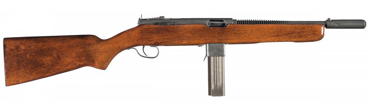 These H&R-Reising SMGs were originally designed/developed in mid 1940 just prior to WWII, and were produced between 1943 and 1945, by the Harrington & Richardson company. The top of the receiver is marked "MODEL 50 H&R REISING --- CAL 45/HARRINGTON & RICHARDSON ARMS CO./WORCHESTER MASS.U.S.A. PAT PENDING". Directly below the rear sight is marked "SAFE/SA/FA", for safe, semi-automatic and full automatic. They have a short, finned barrel similar to the Thompson SMG, with an integral compensator/muzzle break on the end of the barrel. They have a fixed front sight with a stamped sheet metal rear sight, adjustable for elevation only. They are fitted with a pistol grip walnut stock with a flat sheet metal butt plate. It is complete with two original, H&R marked, 20 round magazines, one early one with the dished in sides and the other one is a late blued model with the flat sides. There were approximately 100,000 of these SMGs produced in total with almost all production carbines being issued by the USMC, during WWII. They were made in two configurations; model 50 uses a fixed wooden stock and model 55 used a folding wire stock. These were eventually replaced by the cheaper and easier to manufacture M3 and M3A1 submachine guns in late WWII.