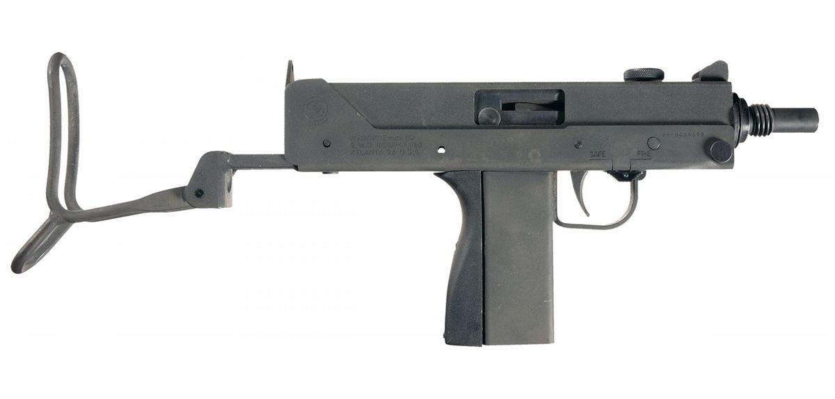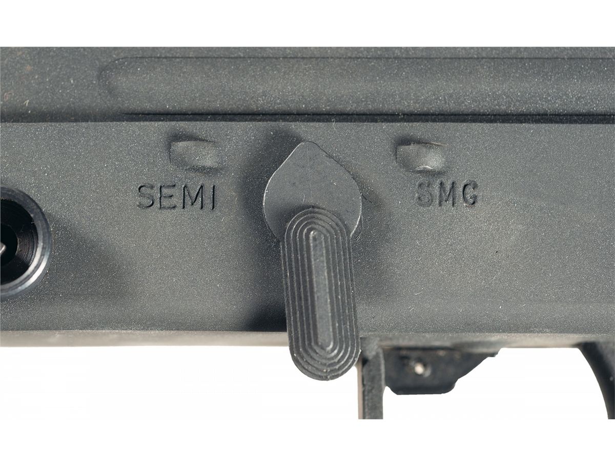 This is an original SWD/Cobray M11 SMG. SWD was the follow-on company to the Military Armaments Corporation, the original producers of the M11 and M10 SMG. It is serial numbered "86-0006102" on the right front end of the receiver and has the standard fixed sights, with the threaded barrel, grooved cocking knob and front strap swivel. The selector switch is marked "SEMI" and "SMG" on the left side with the safety lever on the right side of the receiver. Fitted with the folding/collapsible wire buttstock with contoured butt. Complete with an extra upper receiver, 9 mm barrel, bolt and spring assembly.