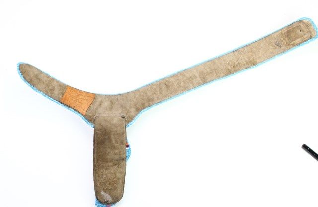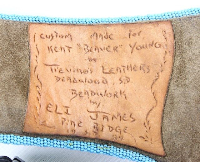 the leather holster built by Ray Trevino Deadwood SD, beadwork by Sioux tribe member Eli James Pine Ridge SD, 1989, fits 32" waist and Colt SA 5 1/2" barrel. Beadwork to nine long months to complete, still shows excellent quality single bead stitch condition. Est. 1000-1800