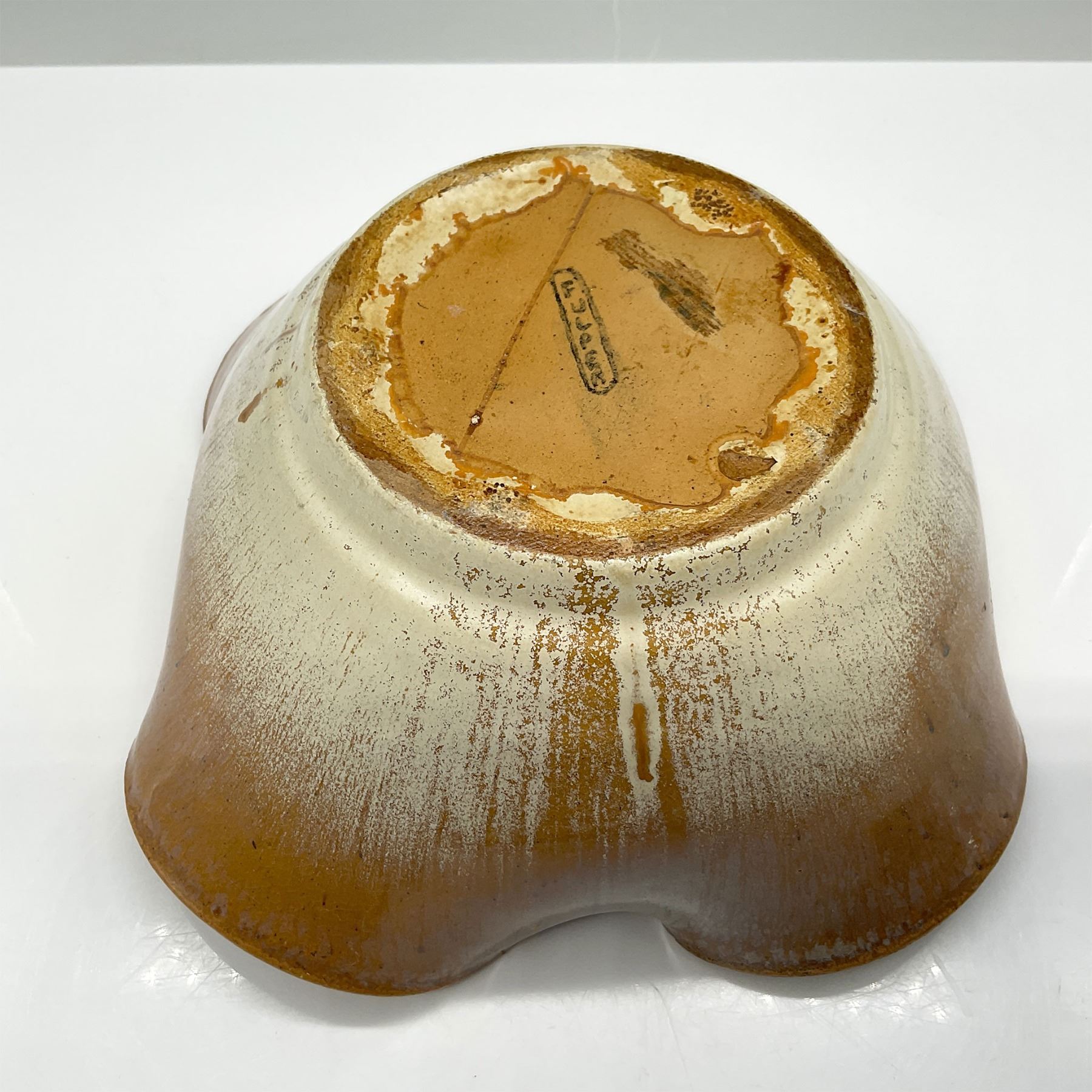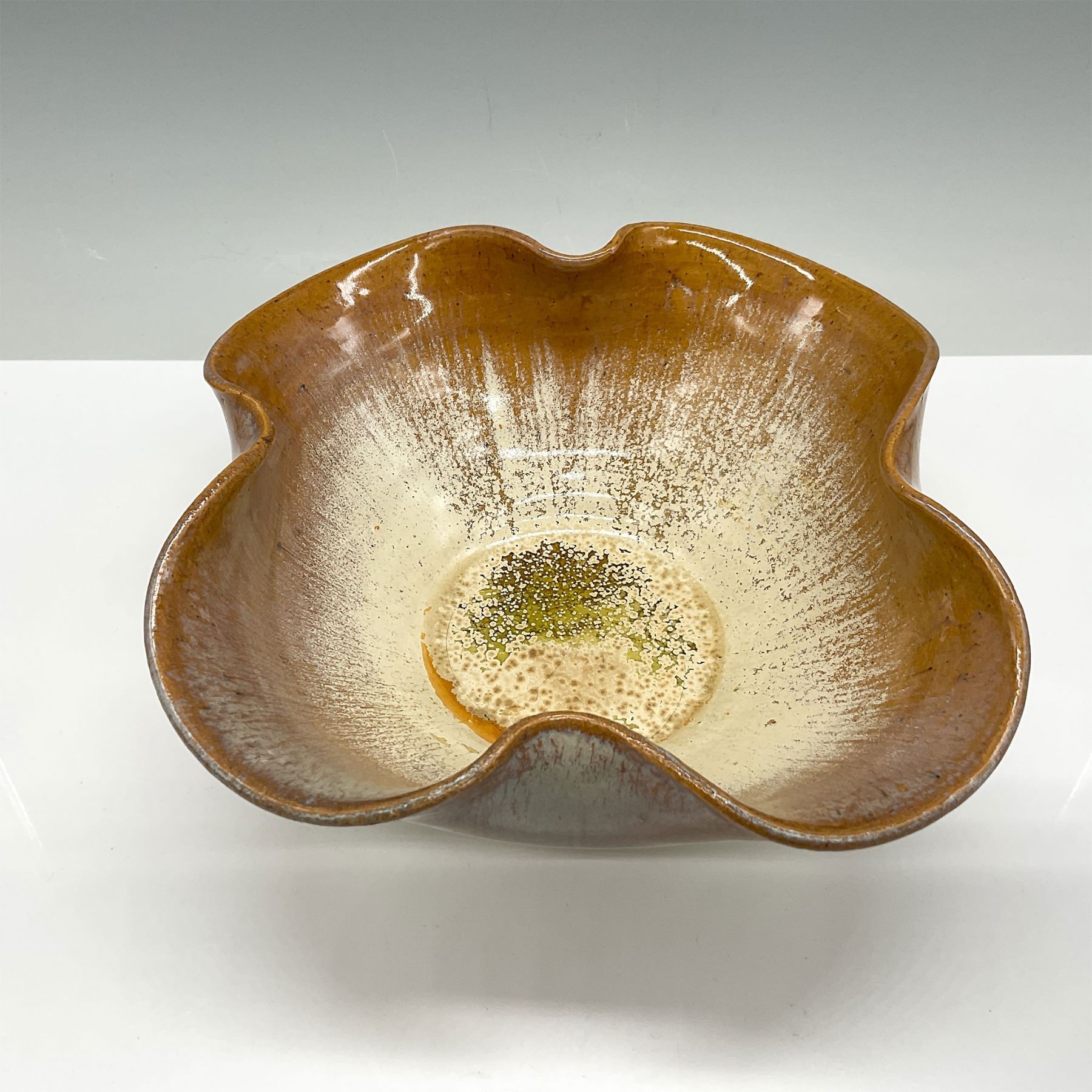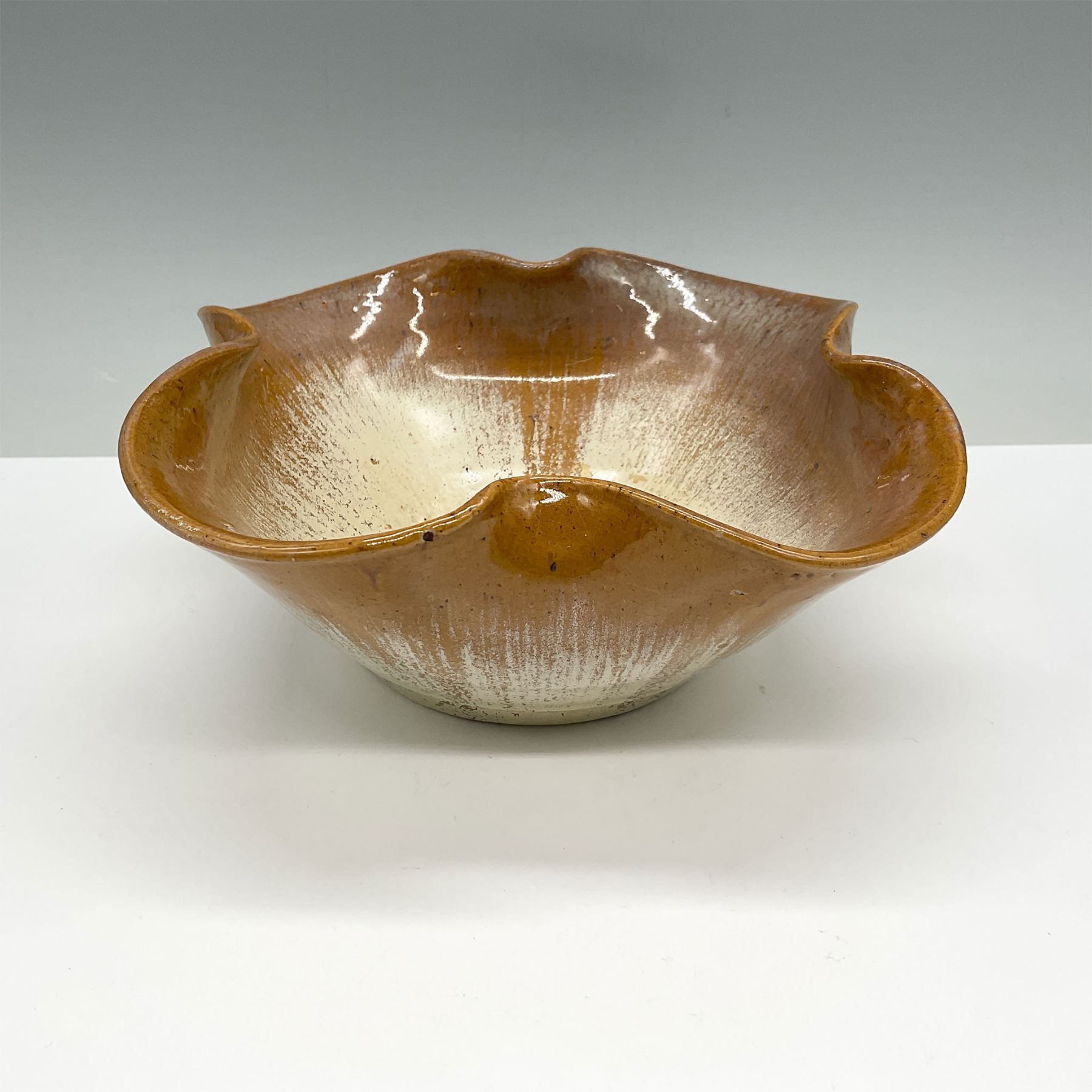 Pottery bowl featuring a fluted rim and a two-tone glaze in earthy orange and cream tones with a speckled finish. This handcrafted piece showcases the distinct artistry and quality synonymous with Fulper Pottery, a renowned American ceramic company known for its innovative glazes and organic designs. The base is marked with the Fulper stamp, indicating its authenticity. A beautiful decorative or functional item reflecting early 20th-century American craftsmanship.