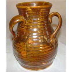 Fulper art pottery vase with three twisted handles and brown glaze marked Fulper on bottom. 7" tall and 3 1/4" dia. At opening.