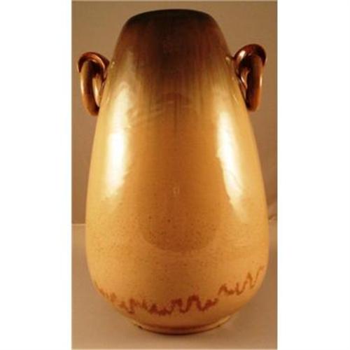 Large Fulper lamp vase with ring handles, covered in Cat's Eye Flambe' glaze. Marked with vertical ink stamp racetrack logo. Section has been broken from one of the ring handles and glued in place but still does not detract from the beauty of this piece. Height 12 5/8 inches and bulbous. Cast hole in the base to accomodate wiring.Monumental!!!!