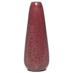 Fulper vase, tapered form covered with a pink and red crystalline glaze, partial paper label, 5.5”h
