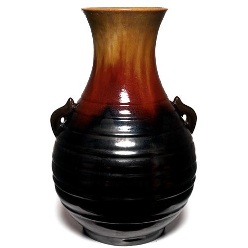 Fulper vase, unusual ribbed and handled form covered with a yellow, orange and brown crystalline glaze, marked, 12"h