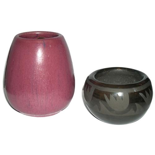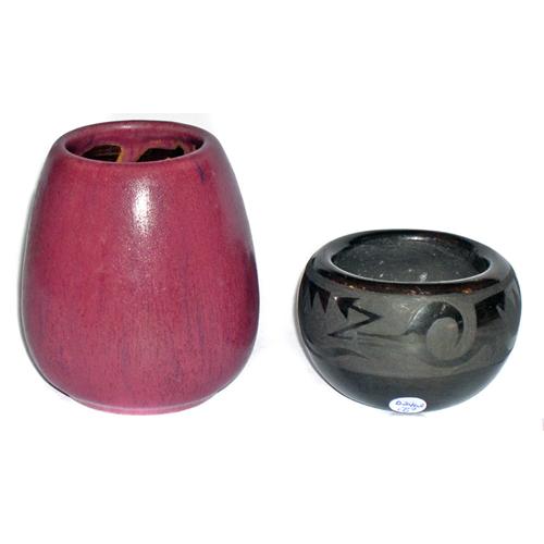 Fulper vase, mottled pink and purple matt, 3.5"h; with a Native American vase, (not shown), black with painted design, signed Lupita Sta. Clara, 2"h, all marked