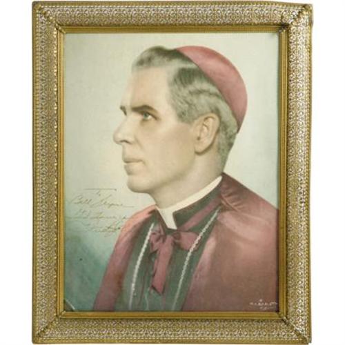 <B>Fulton J. Sheen Signed Portrait.</B></I> A signed portrait of television's first preacher of note, Fulton J. Sheen. From 1951 to 1957, Sheen hosted <I>Life Is Worth Living,</B></I> and later hosted the syndicated show <I>The Bishop Sheen Program</B></I> from 1961 to 1968. The image size is 10" x 13", framed to an overall size of 13" x 16", and is in Very Good condition, though there is slight staining along lower left corner partially affecting signature.<BR><BR><b>Shipping:</b> Framed - with Glass, Small (<a target="_blank" href="http://www.heritageauctions.com/common/shipping.php">view shipping information</a>)