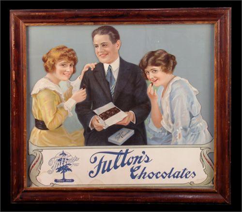 "Fulton's Chocolates" ad depicting a man & 2 ladies die-cut 24 x 26"