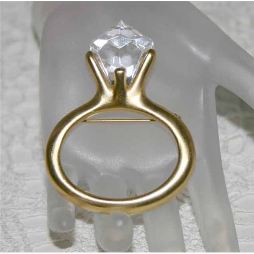 A unique vintage 1950s-60s Brooch representing an Engagement Ring! Huge faceted Lucite represents the solitaire stone secured in prongs and formed into a gold plated metal ring. Securing with original pen-stem measuring 2 ¼ inches long by 1 ¾ inches wide. Perfect for the bride to be! Weighty and well made.