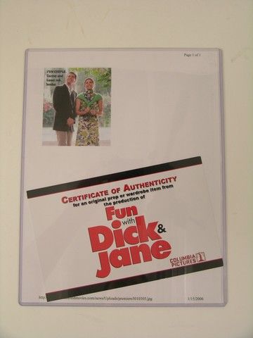 From the comedy remake "Fun with Dick and Jane" (2005), about an upper class couple who have to resort robbery to keep their life-style, this is Jane's (Tea Leoni) hero screen worn shirt. Comes with a COA.