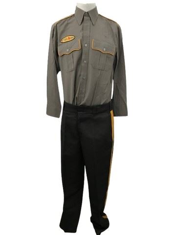 Fun with Dick and Jane (2005) – Toy store guard's screen worn, stunt, gray, Toys -a-Rama Security dress shirt and dark gray dress pants with a mustard colored stripe down the sides of each leg. Shirt is size 16. Toy store guard is written in marker inside the tag. Pants are 36r- guard stunt is written inside the pants.