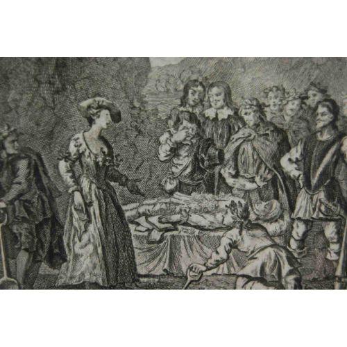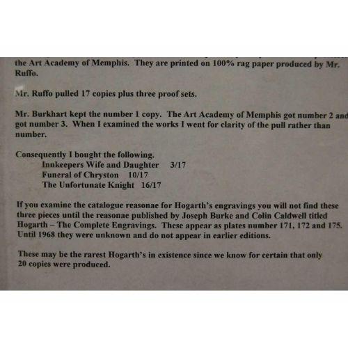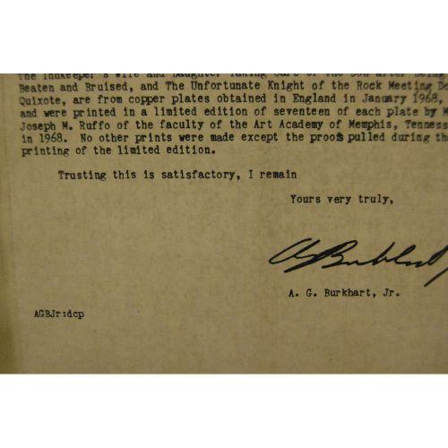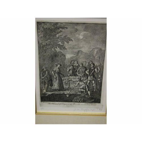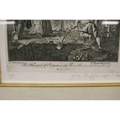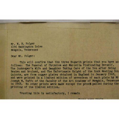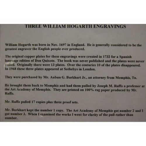 Engraving. Limited Edition #10/17. 9.75"x7.25". The original copper plates for these engravings were created in 1732 for a Spanish language edition of Don Quixote. The book was never published and the plates were never pulled. Originally there were 13 plates. Over the centuries 10 of the plates disappeared. In 1968 these three plates were purchased at Sothebys in London. The new owner brought them back to Memphis and had them pulled by Joseph M. Ruffo, a professor at the Art Academy of Memphis. They are printed on 100% rag paper produced by Mr. Ruffo. Mr. Ruffo pulled 17 copies plus three proof sets. The owner of the plates kept the number 1 copy. The Art Academy of Memphis got number 2.
