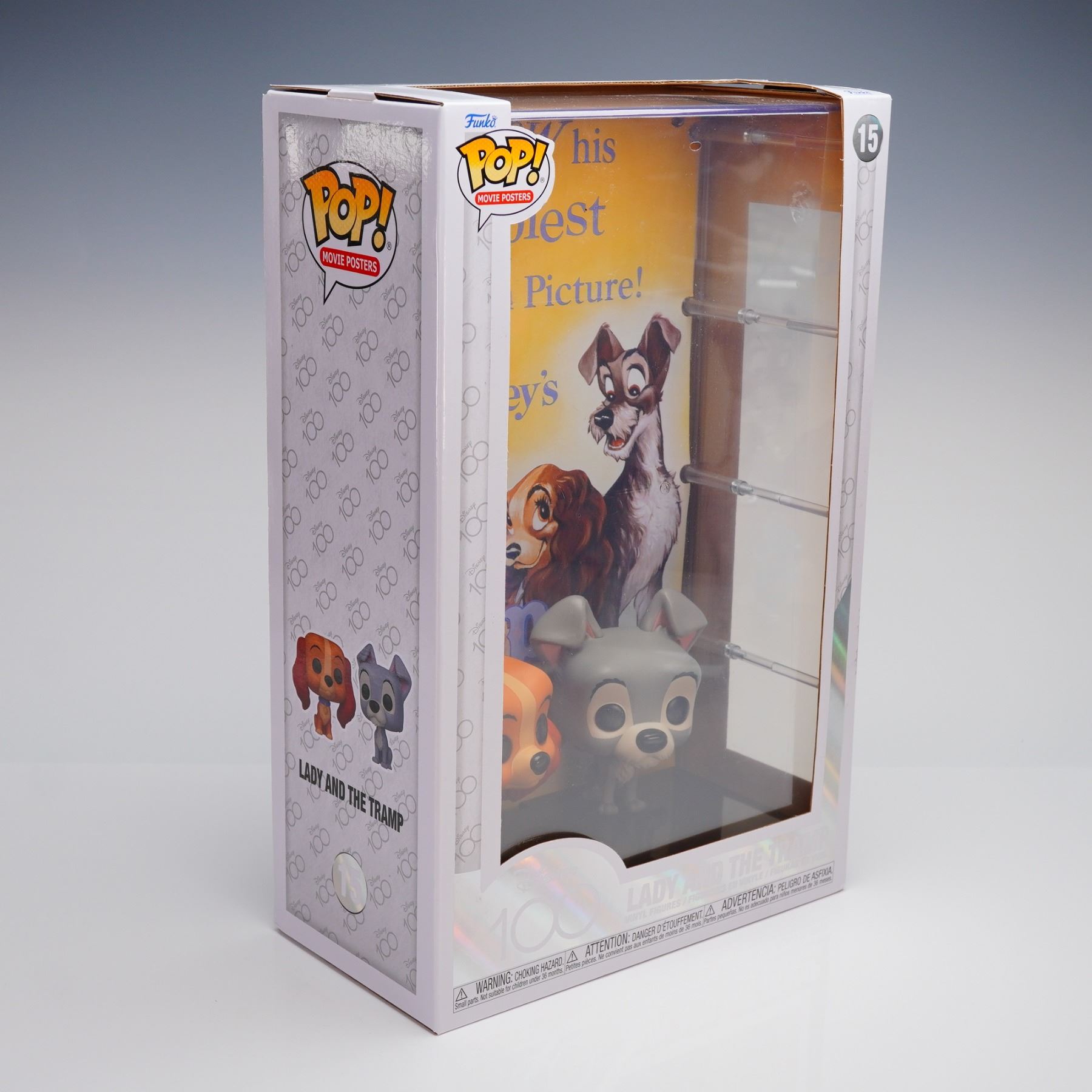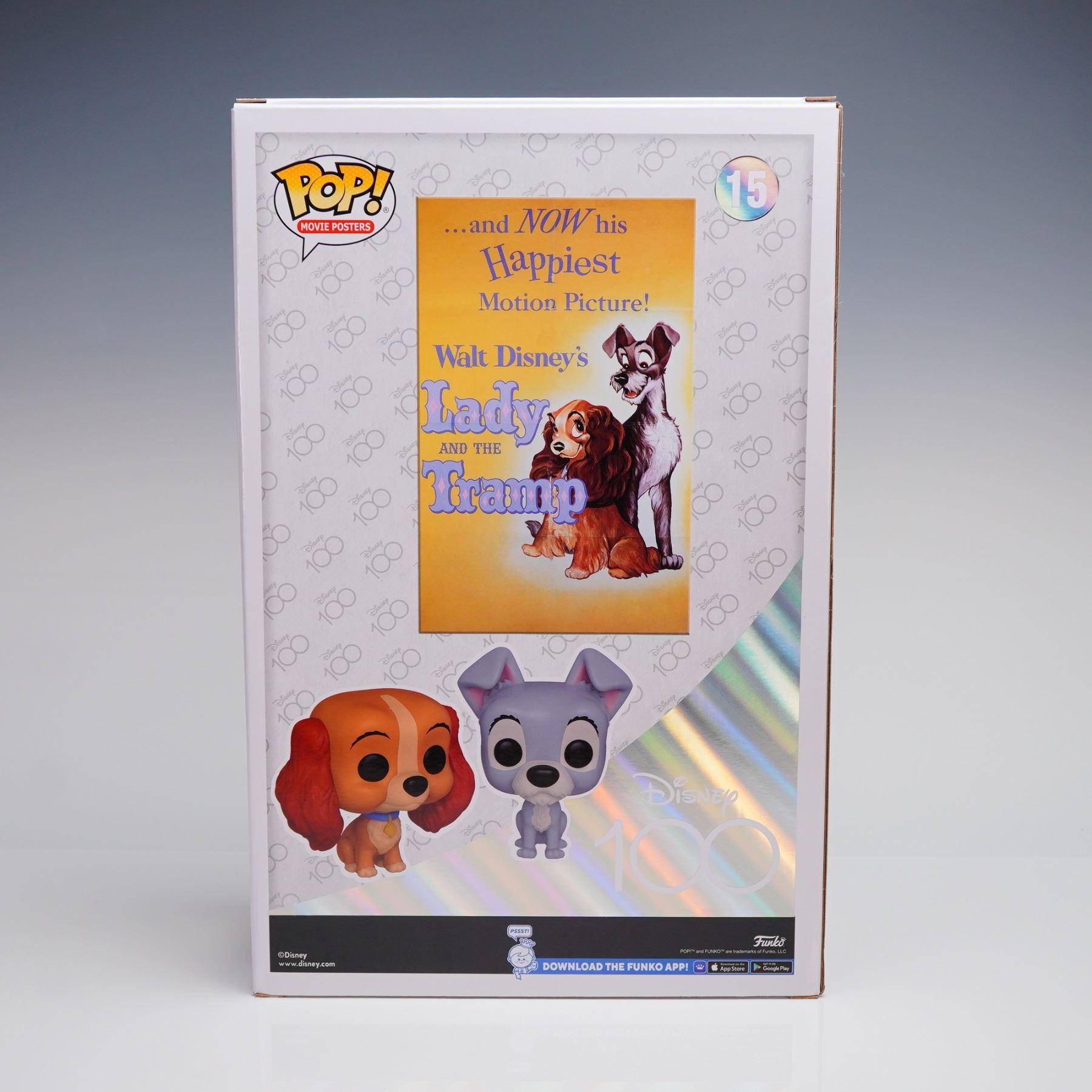 This collectible consists of two stylized vinyl figurines (Lady and Tramp) displayed against a background print replicating the film's original promotional poster art, bearing the text "...and NOW his Happiest Motion Picture! Walt Disney's Lady AND THE Tramp." The set is housed in its original windowed cardboard display box featuring Funko Pop! branding and Disney 100 anniversary graphics, and the number 15.