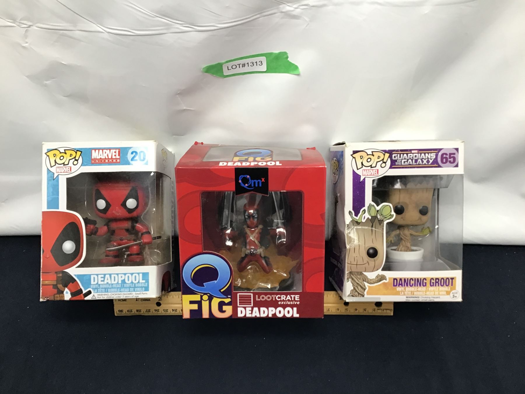 Pop#20 Deadpool Bobblehead, #65 Dancing Groot Bobblehead, Q Fig Loot Crate Exclusive