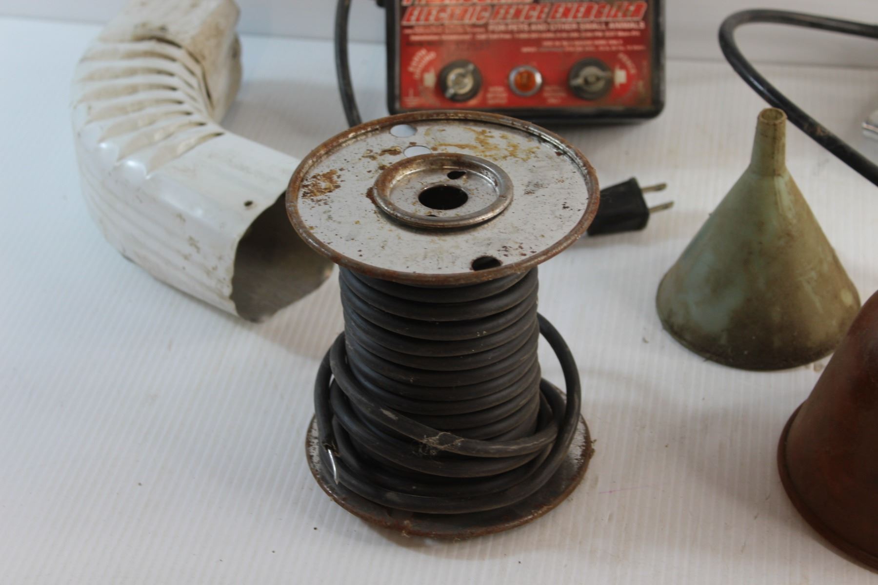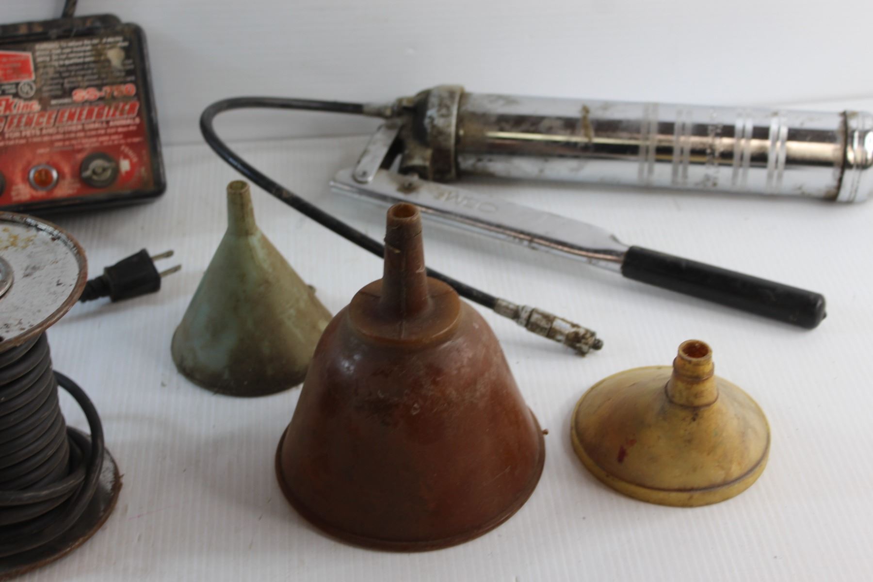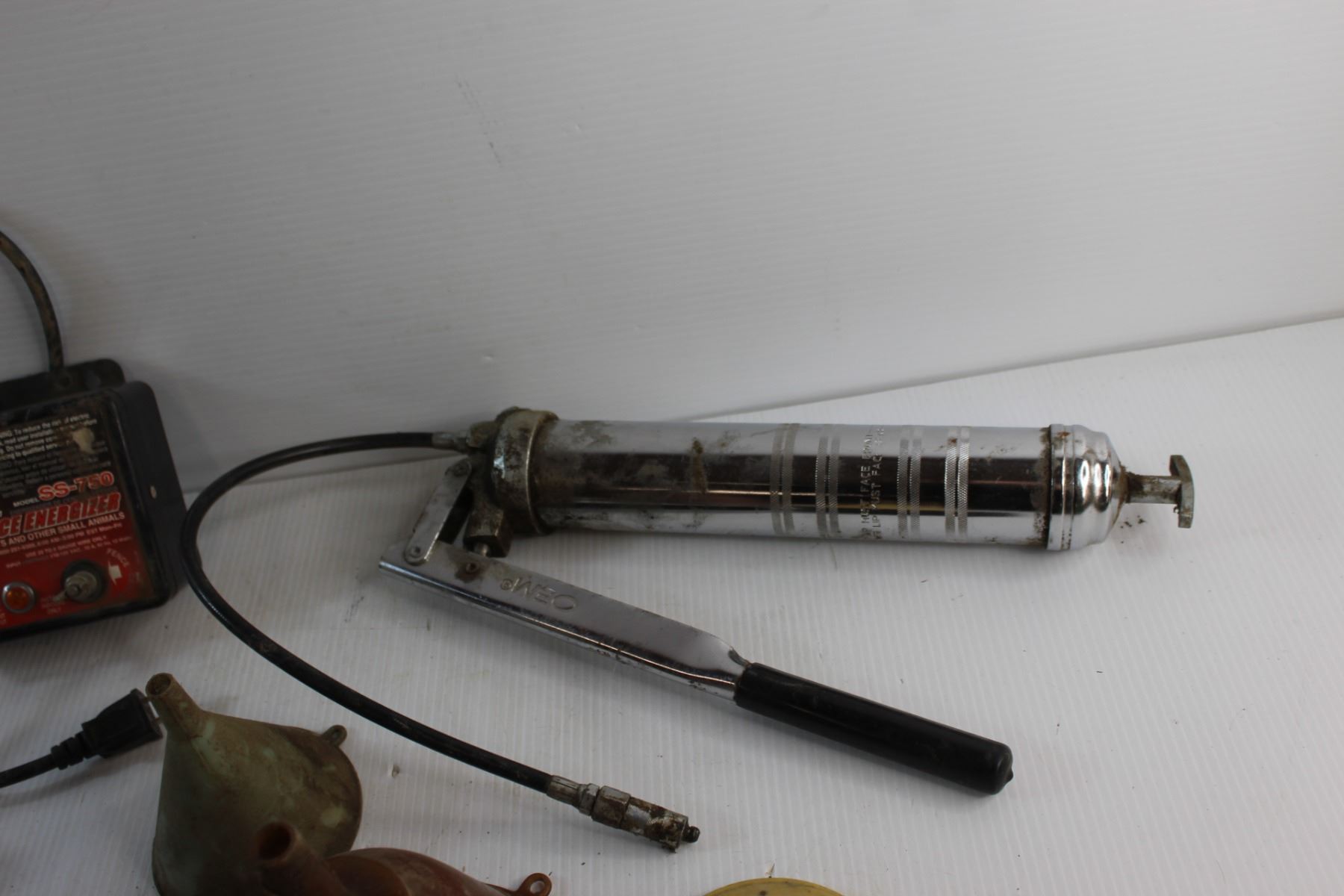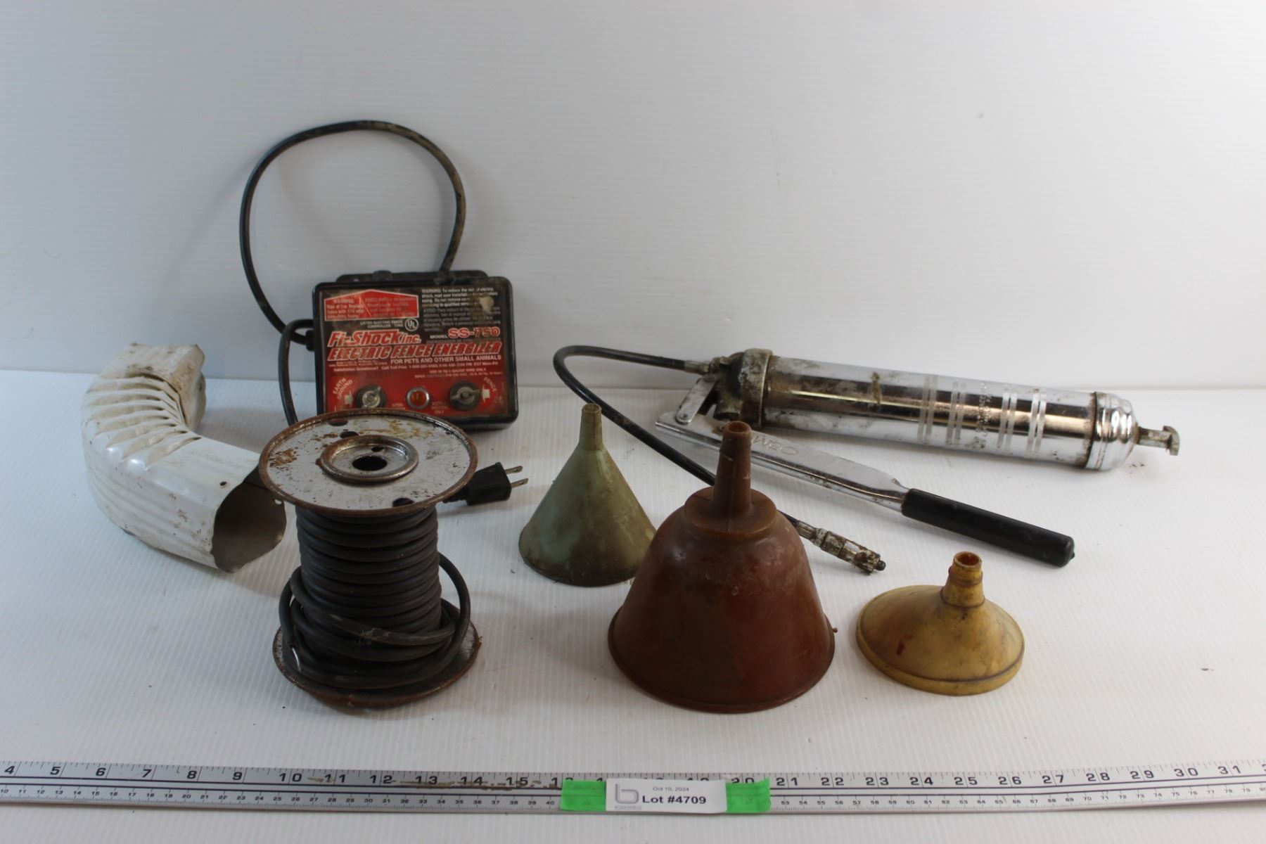 Funnels, Electric Fence Energizer, Grease Pump and Assorted Items
