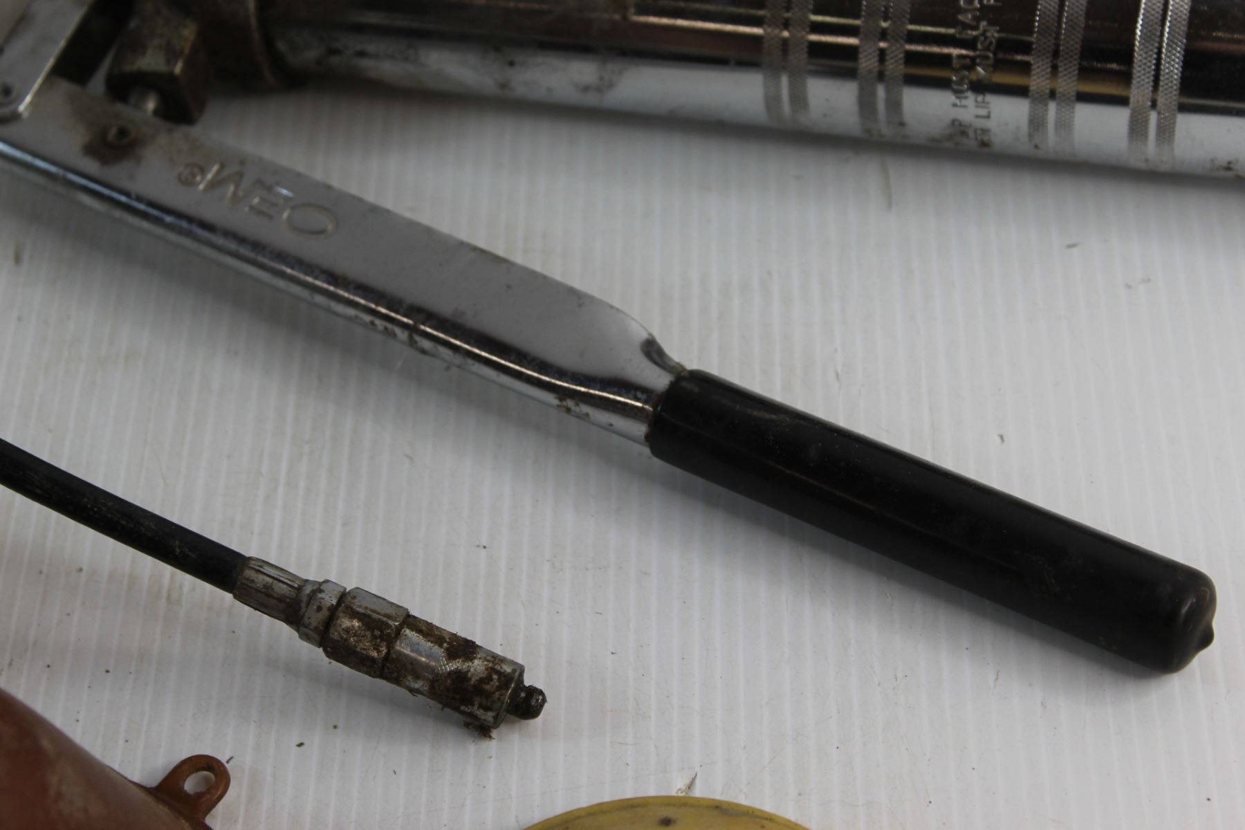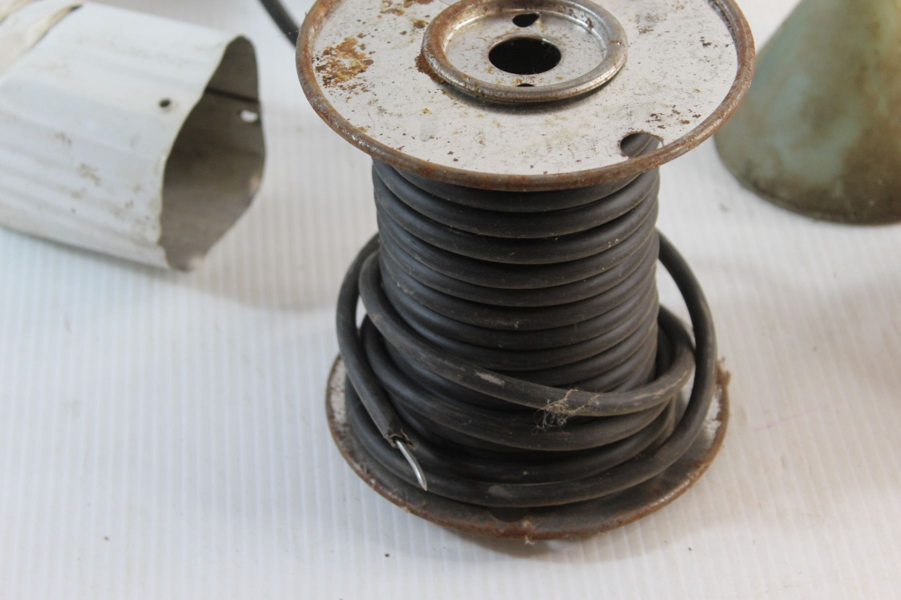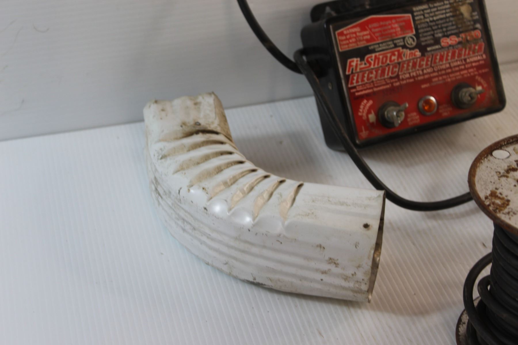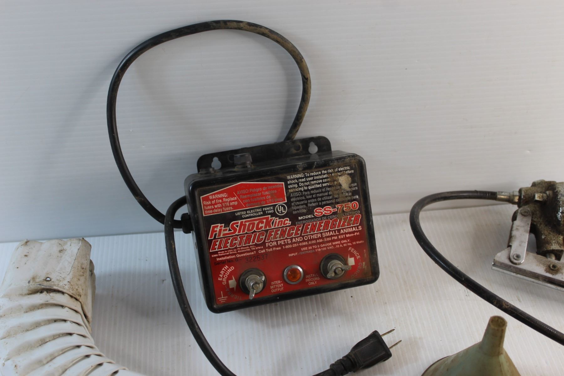 Funnels, Electric Fence Energizer, Grease Pump and Assorted Items
