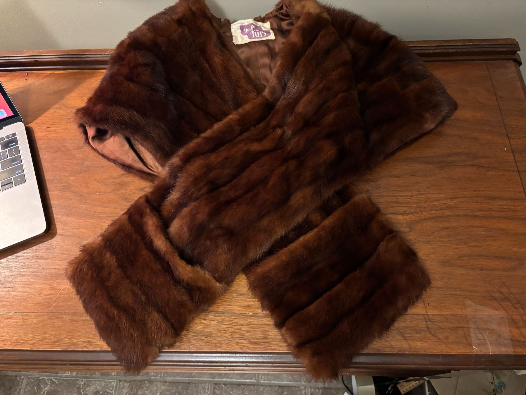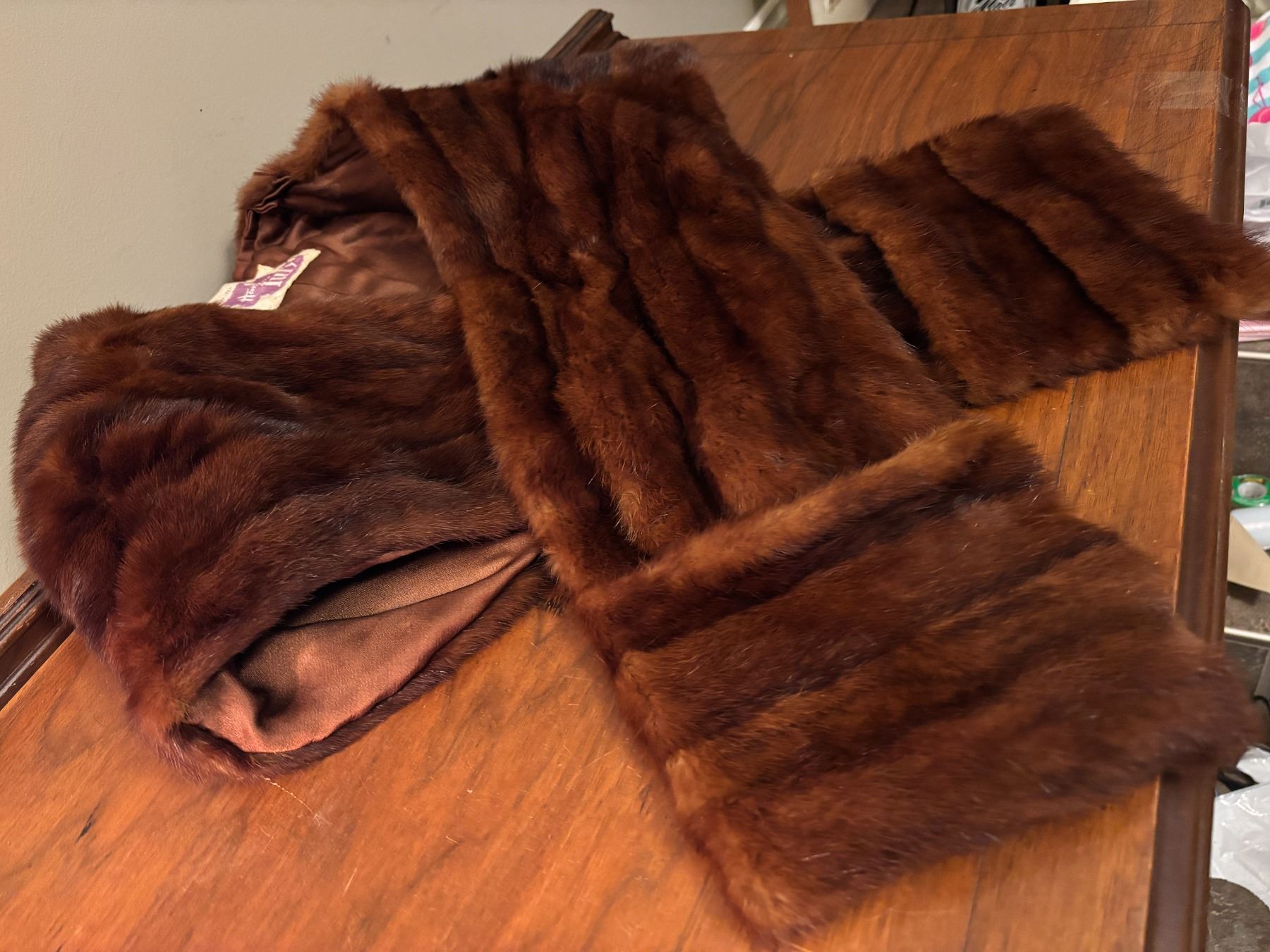 Ladies Genuine Fur Shawl, made by Hanson Furs. Lined and has hand warmers in the front. Also has hand stitched name detail on front right inside.