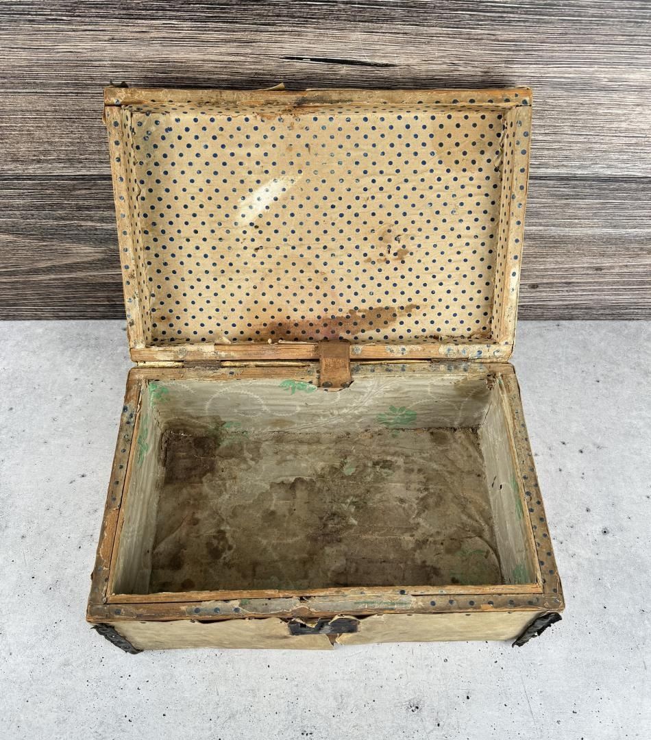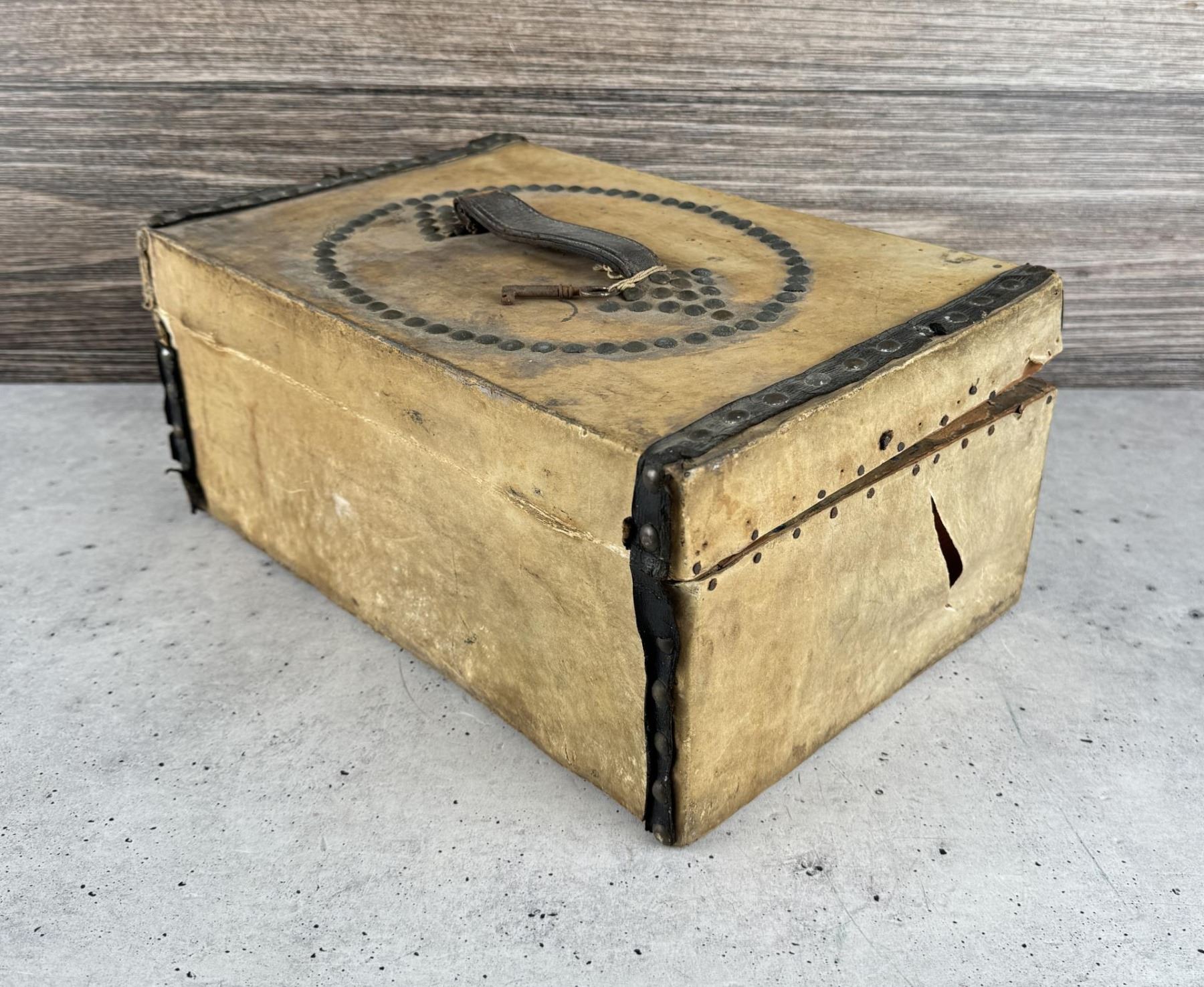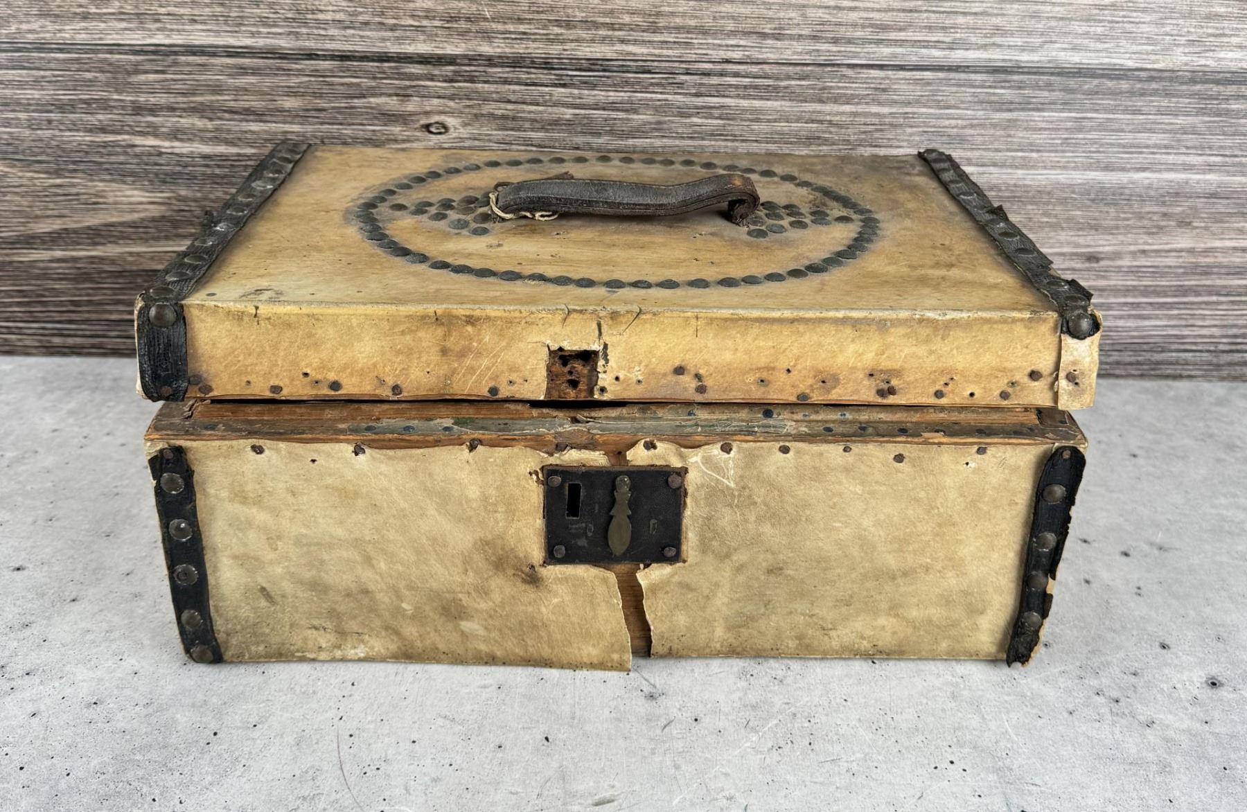 14 1/2" by 9 3/4" by 6 3/4". Hide covered with brass tacks. As traded to the Native Americans, and early Frontier Pioneers. Michael Westergard Collection Inv:285