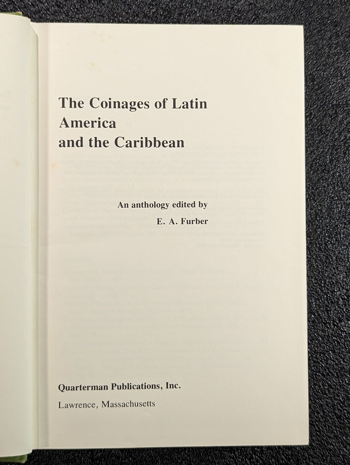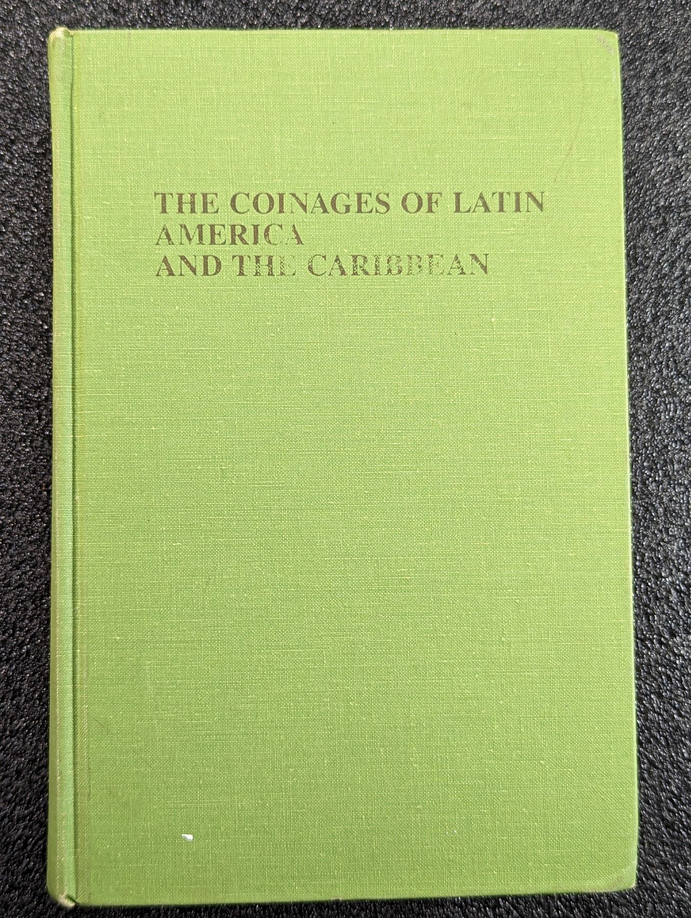 Furber, E.A. (Ed.). THE COINAGES OF LATIN AMERICA AND THE CARIBBEAN. Quarterman Publications, Lawrence. 1974. 8vo. (2), ix, (2), 486, (4) pages. Original lime cloth, gilt. Tables. b&w historical, document, print and coin photos throughout. English text. Near Fine. This is a compendium of articles compiled from the journal, 'The Numismatist' from 1911 to 1971 touching upon a wide range of topics within Latin American and Caribbean numismatics. This adds an index, annotations and a foreword. Lot weight: 2 lbs 1oz. Subject(s): Spanish American, Caribbean Coinage.