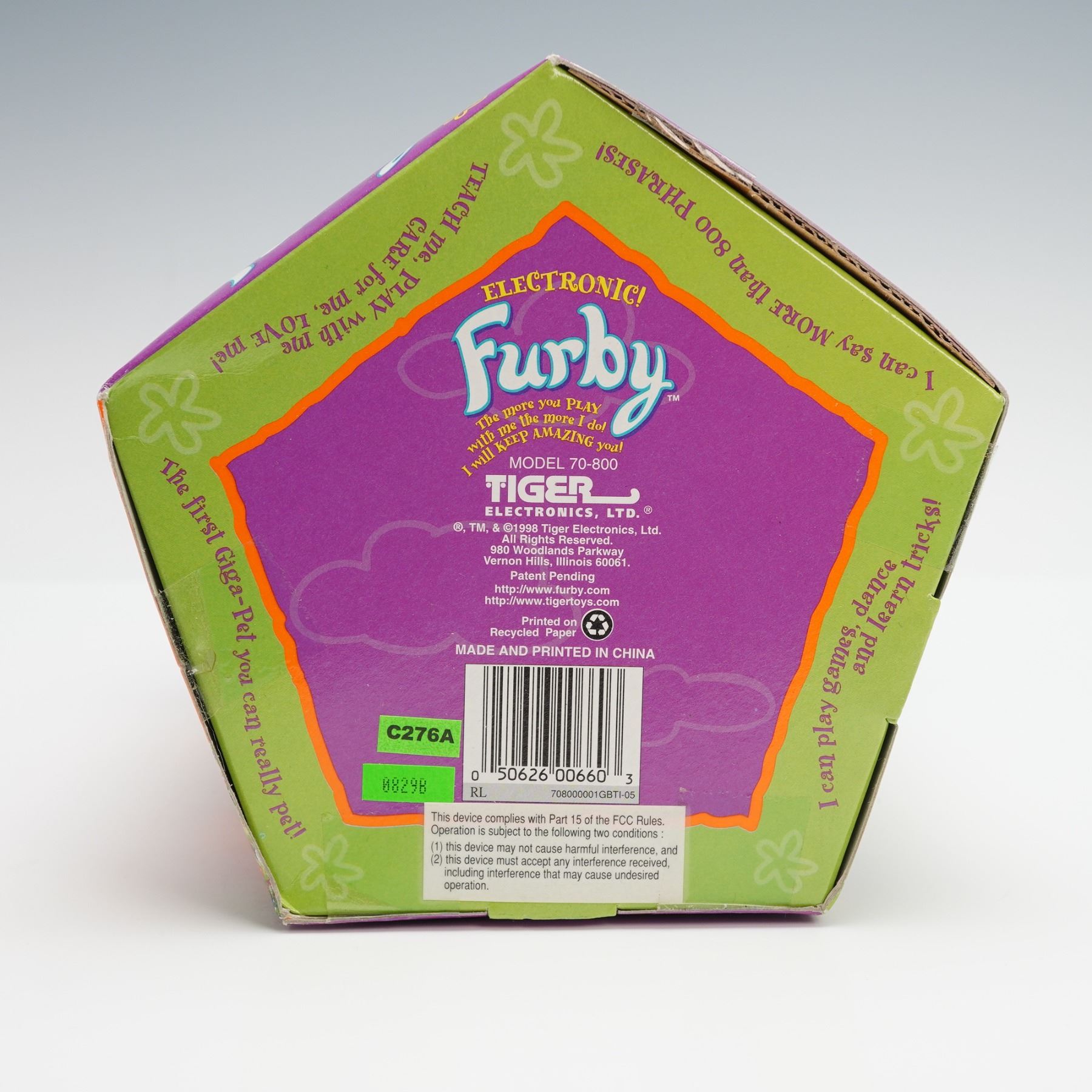 This nostalgic Furby electronic toy produced by Tiger Electronics is in its original packaging and ready to bring back memories of the late 90s. Model 70 800, the toy features Furbys signature design with big eyes, fluffy fur, and a playful personality. The box showcases fun details including the Furby's unique language and quirky behavior, encouraging interaction and play. Ideal for collectors of vintage toys, electronic novelties, and fans of the Furby craze, this item is an excellent addition to any retro collection.
