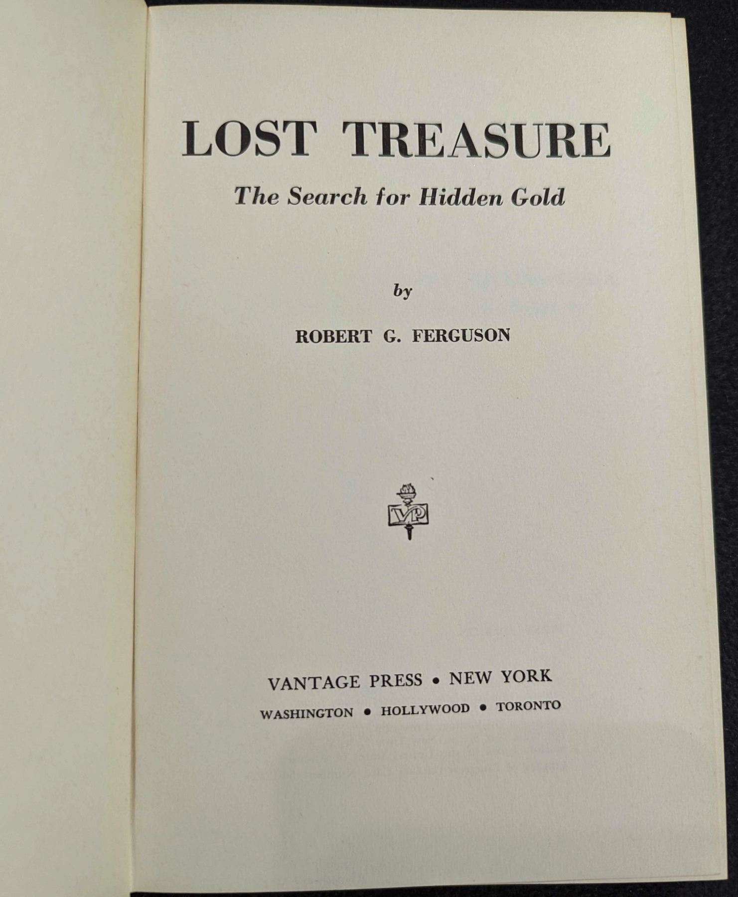 Furguson, Robert G. LOST TREASURE. THE SEARCH FOR HIDDEN GOLD. Vantage Press. 1957. 12mo. (2), 135, (3) pages. New York. first edition. original tan cloth, lettered in black. Glossary. Fine. This book is a collection of tales of treasure hoards and lost mines from the old West that have been researched by the author. Scarce in hardcover. Lot weight: 0 lbs 10oz. Subject(s): Buried Treasure.