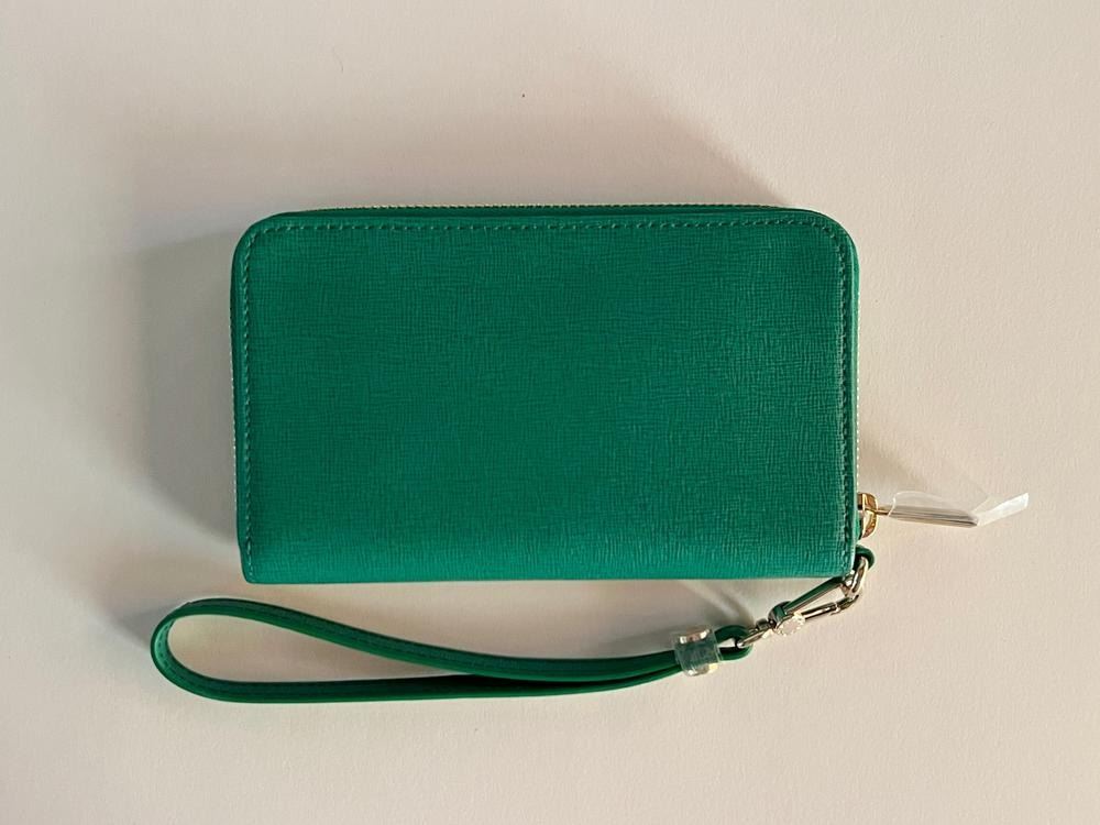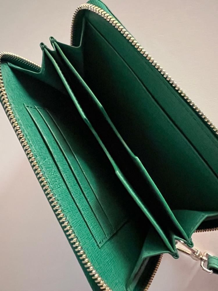 Furla Babylon L zip around wallet/wristlet in Emerald leather. High quality embossed leather with 4 credit card slots, 3 separated inner compartments, and removable wrist strap. Brand new with tags in original box with dustbag