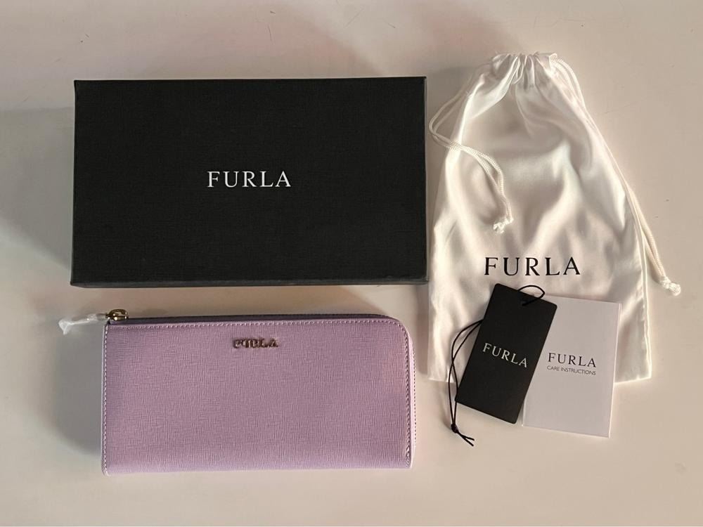 Furla Babylon XL Zip around L wallet in Lavanda leather. High quality embossed leather L-shaped zip-wallet. L-shaped open accessible contents: Coin purse wallet 2 card has eight, 2 pockets and storage capacity is excellent. Brand new with tags in original box with dustbag