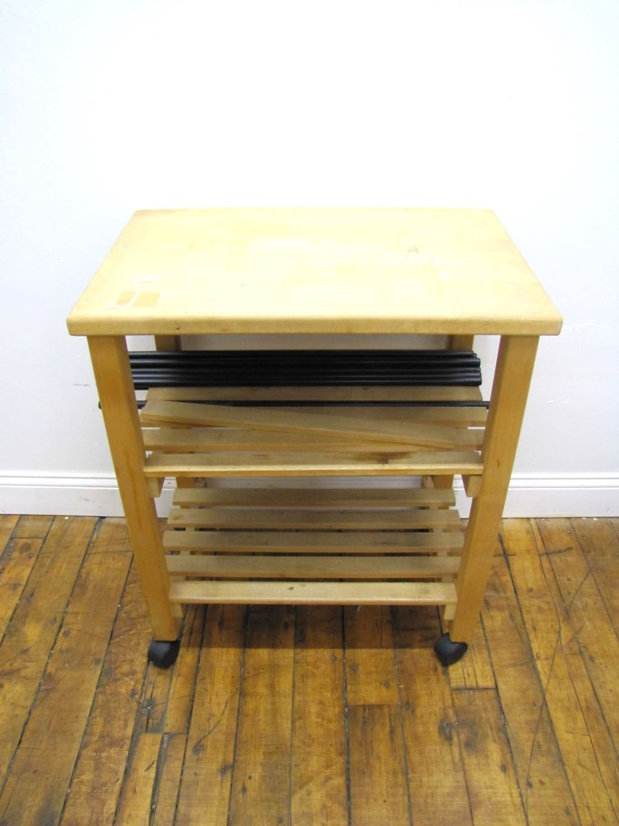 Furniture (1): Rolling kitchen cart – wood with butcher block top, two slat shelves – 30.5 x 26 x 17Furniture (2): Metal wire bookshelf (4 shelves), Glass top magazine table (dirty – used)** Personal Asset Formerly Belonging to James "Whitey" Bulger or Catherine Greig. Item(s) must be picked up and removed from the Boston Convention & Exhibition Center by 5:00 P.M. EST on Sunday, June 26th.