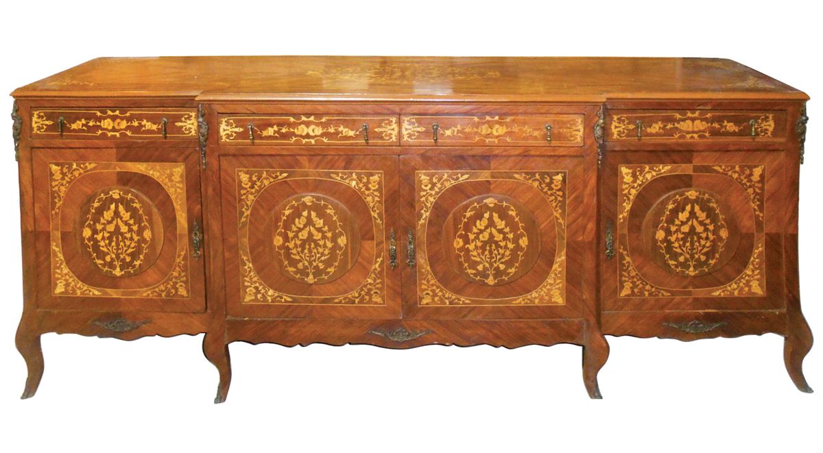 Furniture, French-style buffet server, mahogany veneer w/massive floral inlay, metal Cherubim on front corners & beautiful metal ornamentation across base, 4 drwrs w/metal tear-drop pulls & 4 storage doors, cabriole legs support this unique piece, overall VG cond w/some signs of wear & minor veneer chips, 39.5"H x 93"W x 22"D.