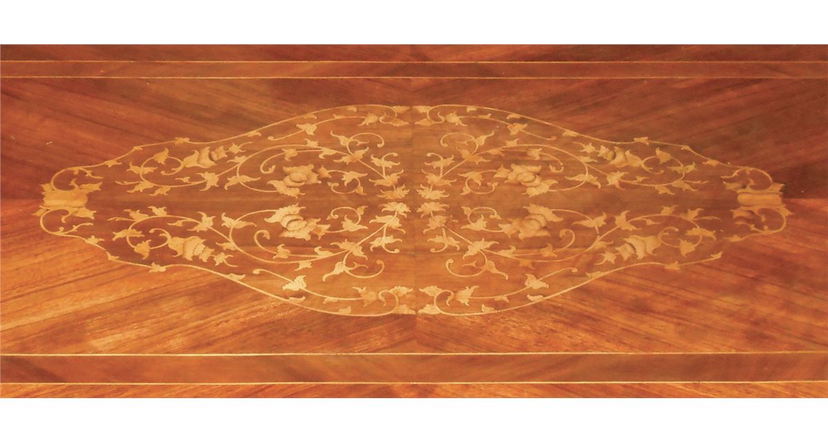 Furniture, French-style buffet server, mahogany veneer w/massive floral inlay, metal Cherubim on fro