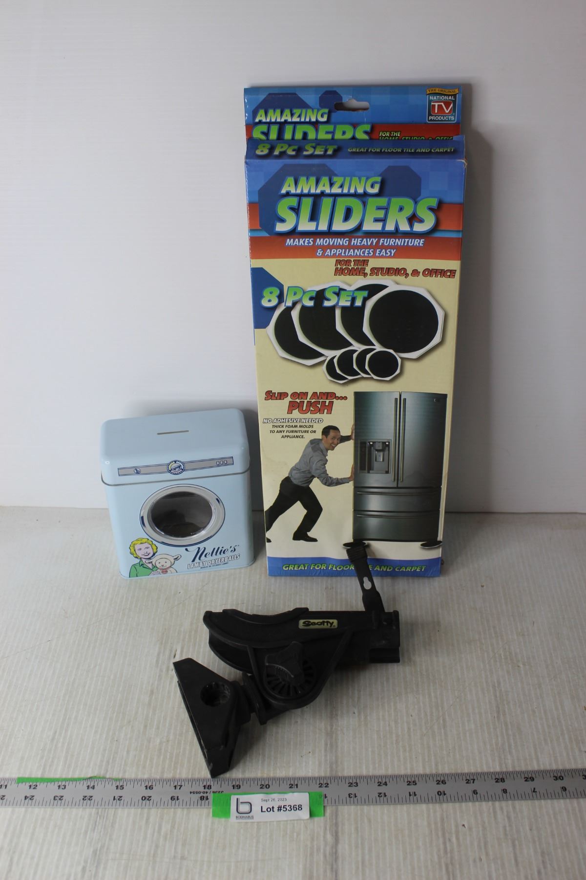 Furniture Sliders, Washing Machine Tin Coin Bank, Misc.