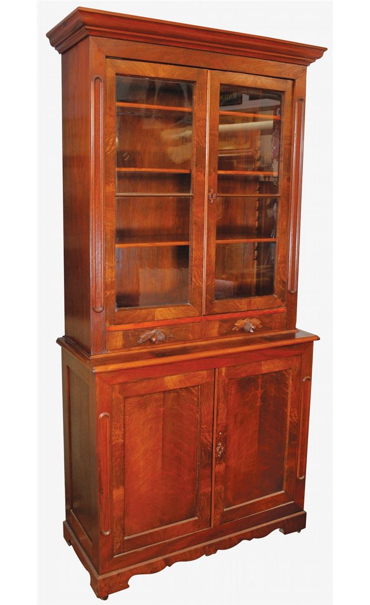 Furniture, bookcase or cupboard, 2-pc walnut w/matched flame veneers throughout, c.1870's, fruit pulls, molded trim on front panels, Exc cond w/older surface, missing pull knob on lower door, 92"H x 44"W x 20"D.