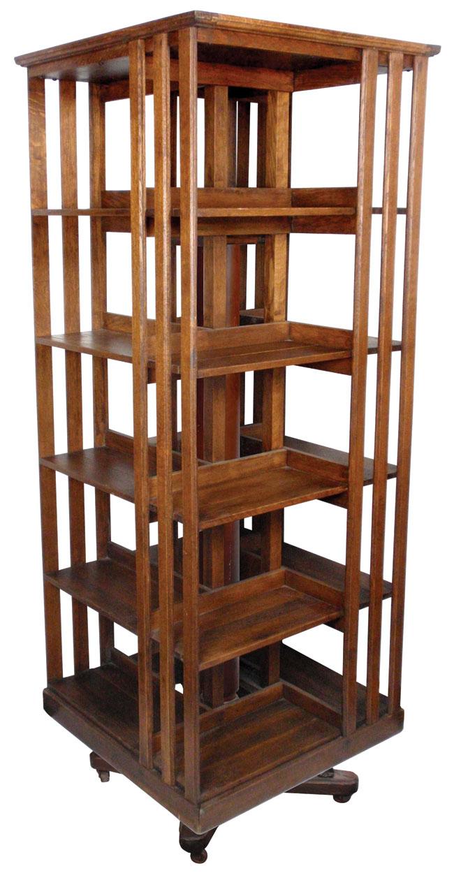Furniture, revolving bookcase, oak 5 shelf on castored base, Exc cond, 70"H x 25"Sq.