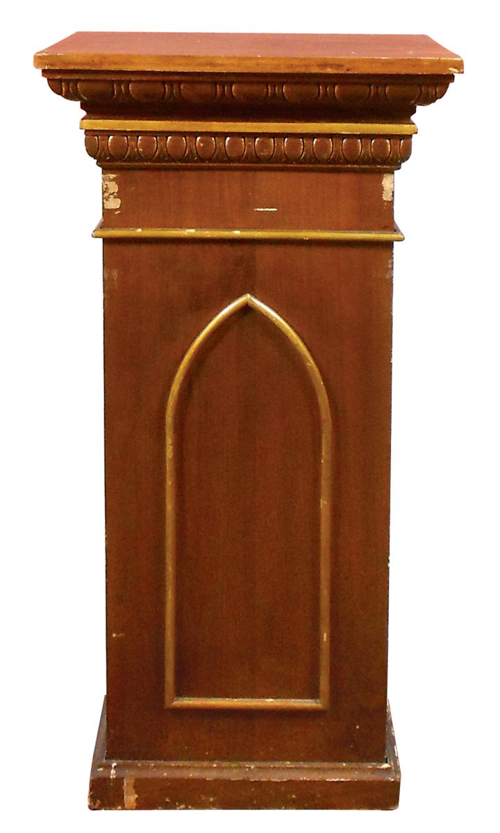 Furniture, stand, pine w/egg & dart molding & arched detail on front & sides, from an old Iowa church, VG cond w/some loss of orig finish, 40"H x 20"W x 14"D.