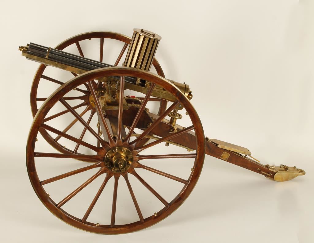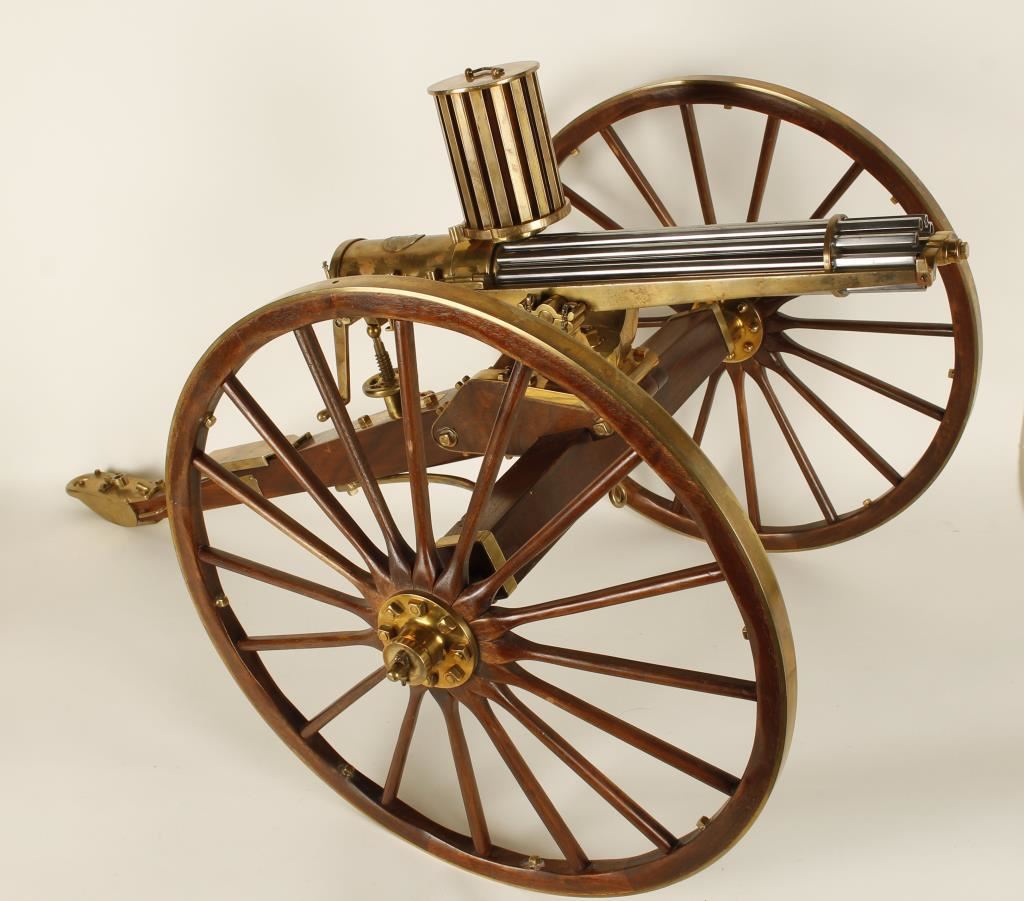 1/7th scale model Mounted on a carriage, with canister fed 10 steel in white barrels with brass construction. Wooden wheels and stand. In overall excellent condition, however it is missing the traverse and elevation part that holds the gun up and lets it move back and forth. Modern Firearm*
